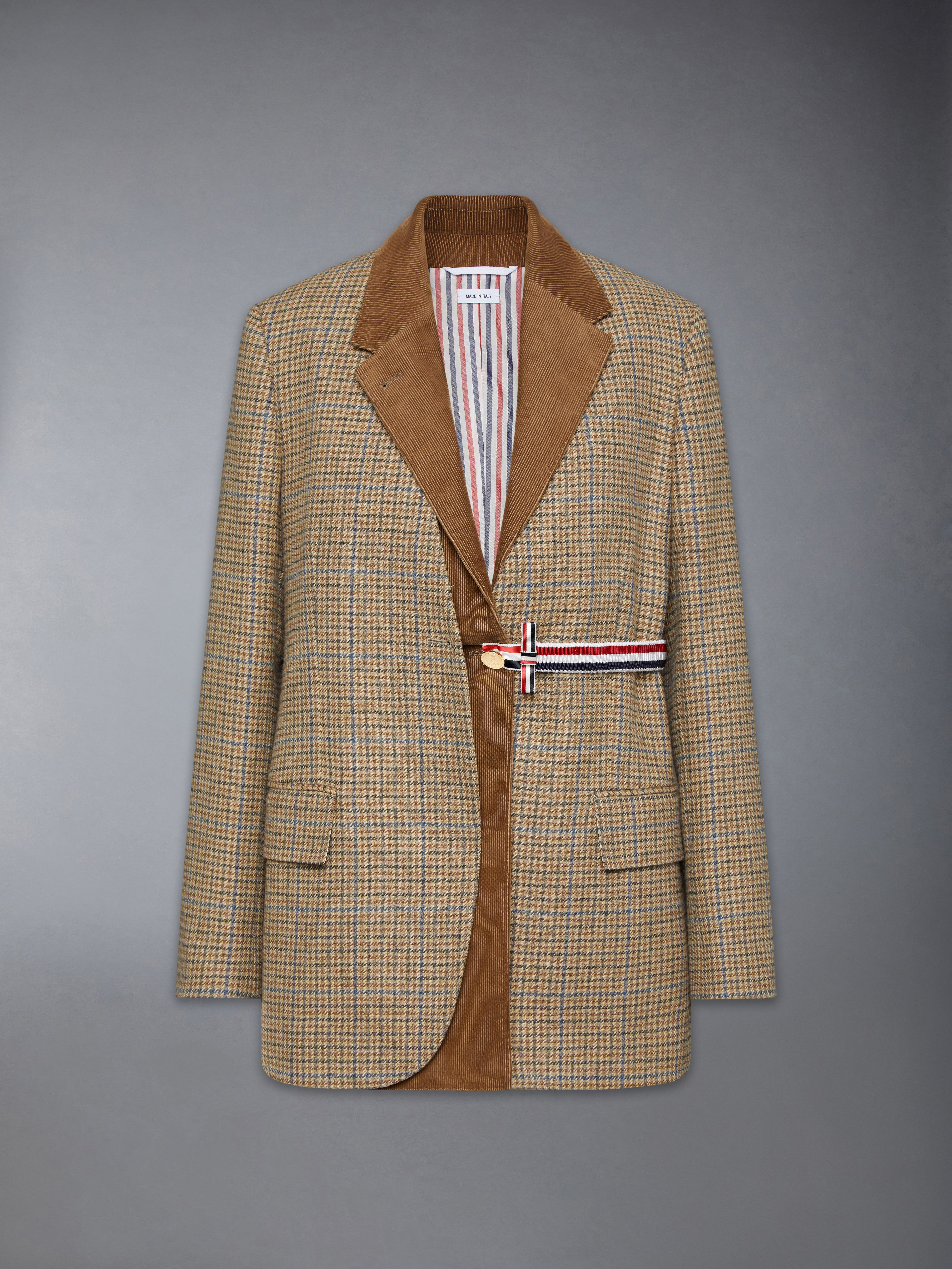 A jacket that embodies signature Thom Browne tailoring with narrow shoulders and a double-layered construction. The inner layer functions as a standalone vest, offering a versatile 2-in-1 design that adapts effortlessly to shifting temperatures. With a combination of sheen corduroy and cheviot tweed, it's the perfect piece for transitional dressing between summer and fall. Front button closure with striped grosgrain bow 4-bar detailing 2 Front flap pockets Single chest pocket Buttoned cuffs with signature striped grosgrain trim Interior pocket with name tag Removable sleeves Reversible Signature striped grosgrain loop tab Model is 5'10" (178 cm), wearing size 40 100% Wool Combo 1: 100% Cotton Lining: 100% Cupro Made in Italy FBC938C-F0961-210