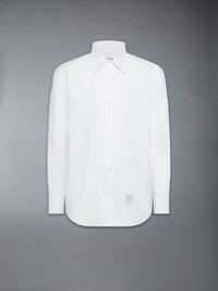 A seasonal crest stitched in tonal embroidery brings together core brand motifs including athletic emblems, the number 65, a nod to Thom Browne’s birth year, and Hector, marking ten years of the beloved dachshund. Rendered in satin, running, and pencil stitch, the design is set against solid oxford cotton, anchoring a clean silhouette elevated through craftsmanship and layered meaning. Front button closure Button-down point collar Buttoned cuffs Split pleated back yoke with locker loop Curved hem Name tag applique Satin and running stitch Hector crest embroidery Signature striped grosgrain loop tab Straight fit Model is 6'1" (185cm), wearing size 1 100% Cotton Combo 1: 100% Polyester Made in Italy MWL272E-E1518-100