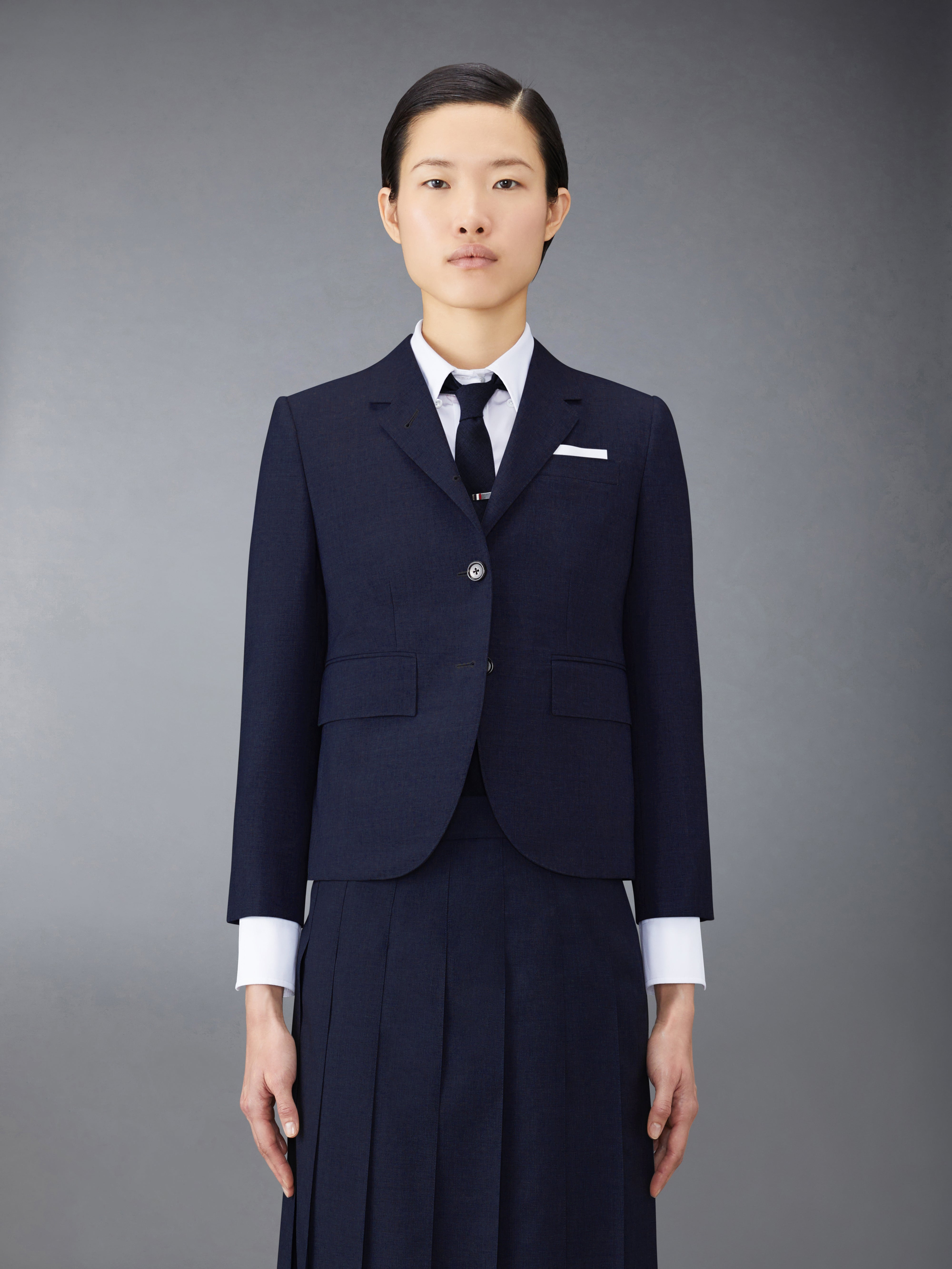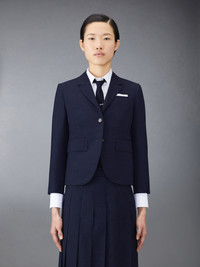 DETAILS & FIT Our Plain Weave School Uniform High Armhole Sport Coat embraces a slimmer fit taken from punk influences, while remaining true to Thom Browne’s classic heritage. Pair with our School Uniform Pleated Mini Skirt. Button front closure Notched lapels Single chest pocket Buttoned cuffs with signature striped grosgrain trim Double vented back Striped lining with Interior pocket and name tag Signature striped grosgrain loop tab at back of neck High ArmholeFit 3 Model is 5' 10"" (178cm), wearing size 40 50% Wool, 50% Polyester Made in Italy FBC010V-02872-415