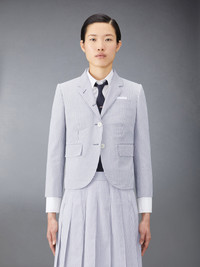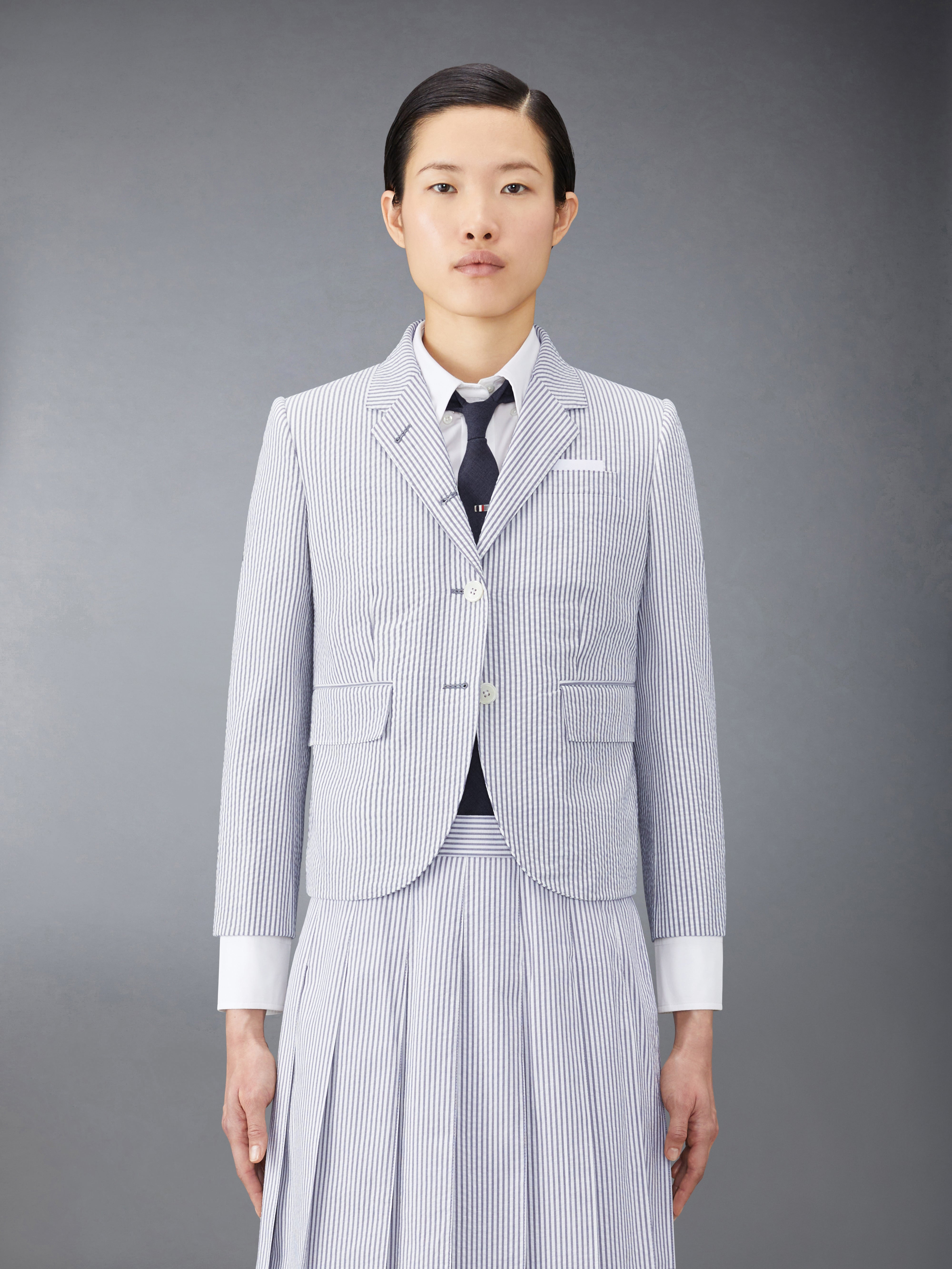 DETAILS & FIT Our Seersucker Slim Fit Sport Coat embraces a slimmer fit taken from punk influences while remaining true to Thom Browne’s classic heritage. Enjoy our airy seersucker fabric during warmer months. Front button closure Notched lapels 3 flap front pockets Single chest pocket Buttoned cuffs with signature striped grosgrain trim Double back vent Striped lining with interior pocket and name tag Signature striped grosgrain loop tab at back of neck High ArmholeFit 3 Model is 5' 10" (178cm), wearing size 40 100%Cotton Made in Italy FBC010H-00572-415