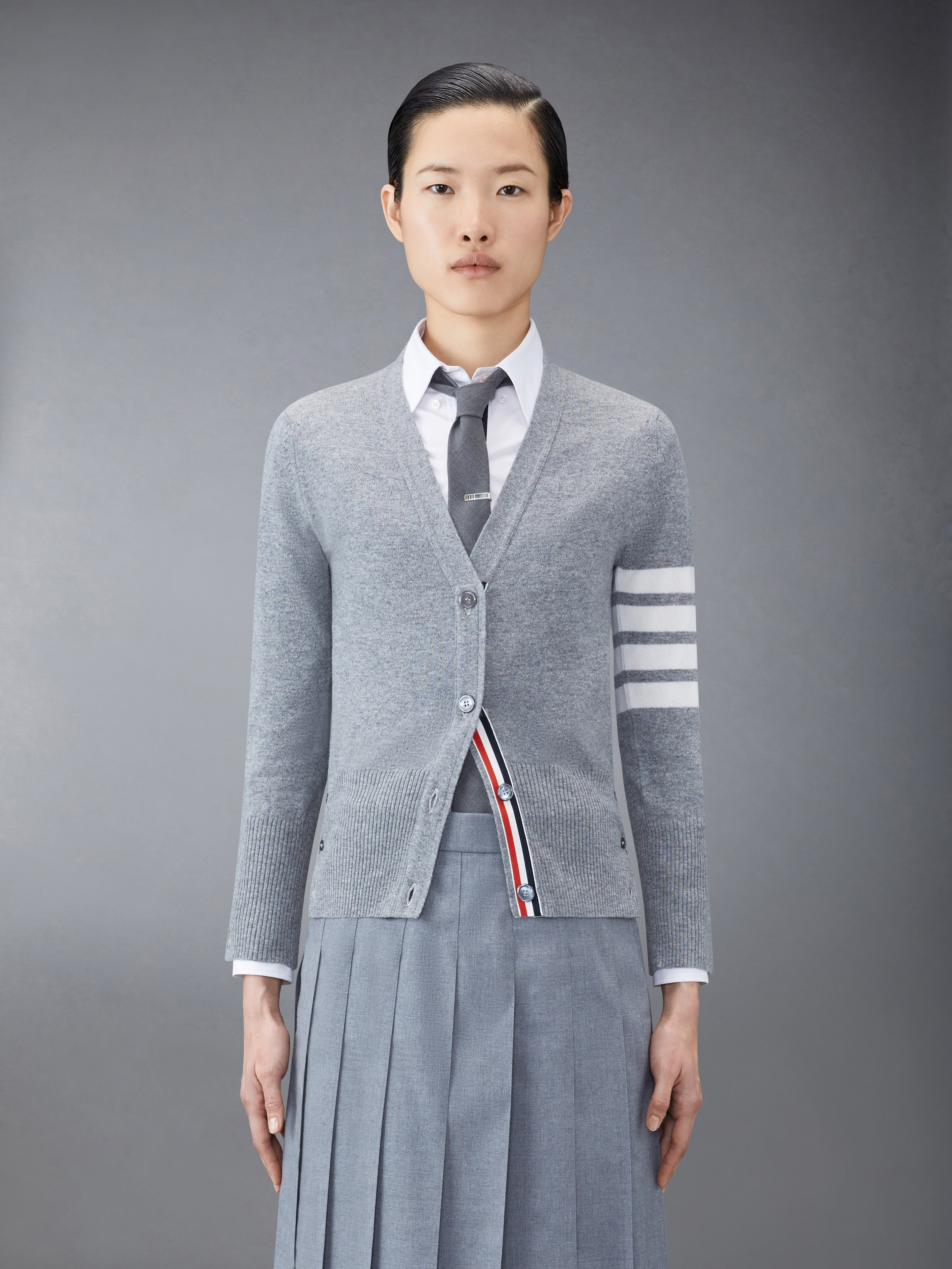 DETAILS & FIT Two Thom Browne emblems define our Classic Cashmere 4-Bar V-neck Cardigan — grosgrain trim and 4-Bar stripe detailing, both synonymous with the brand. Presented in 100% rich cashmere, this cardigan exudes sophistication. V-neckline Front button closure with striped grosgrain placket 4-bar stripe detail at left sleeve Buttoned side vents and cuffs with signature striped grosgrain trim Signature striped grosgrain loop tab at back of neck Model is 5' 10" (178cm), wearing size 40 100% Cashmere Made in the UK FKC001A-00011-055 - Shoulder Width: 33.0cm - Length: 55.0cm - BUST: 76.0cm