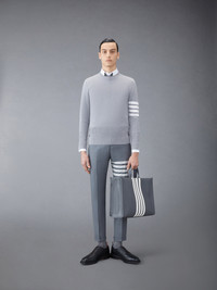 DETAILS & FIT A signature Thom Browne emblem defines our Wool 4-Bar Pullover. Inspired by varsity stripes, our 4-Bar design is Thom Browne’s most sought-after icon. Presented in fine merino fabric, this pullover is a longstanding staple. Crew neckline 4-bar stripe detail at left sleeve Buttoned side vents and cuffs with signature striped grosgrain trim Signature striped grosgrain loop tab at back of neck Model is 6' 1" (185cm), wearing size 1 100% Merino Wool Made in Italy MKA189A-00014-055
