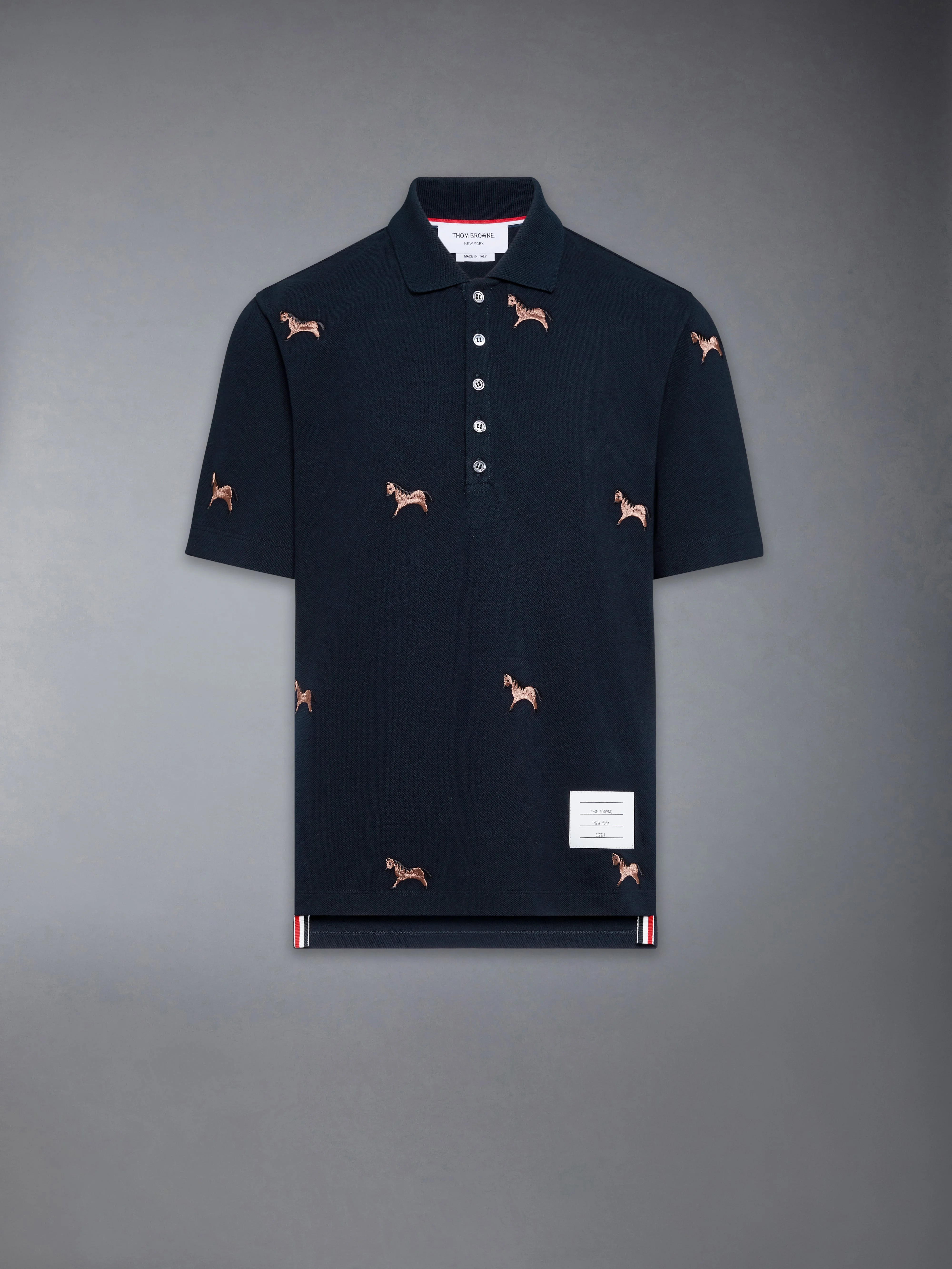 In celebration of the Year of the Horse, this short-sleeve polo features an allover satin-stitched horse motif, symbolizing discipline and forward motion. Pair with chino trousers and Collegiate Sneakers to echo classic campus codes. Partial front button closure Ribbed collar Buttoned side vents with RWB grosgrain trim Stepped hem Allover horse embroidery Name tag applique Signature striped grosgrain loop tab Model is 6'1" (185cm), wearing size 1 100% Cotton Combo 1: 97% Cotton, 3% Elastane Combo 2: 100% Polyester Made in Italy MJP242E-00050-415