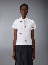 In celebration of the Year of the Horse, this short-sleeve polo features an allover satin-stitched horse motif, symbolizing discipline and forward motion. Crafted in classic cotton pique, the silhouette balances uniform precision with a playful sense of pattern. Partial front button closure Ribbed collar Buttoned side vents with RWB grosgrain trim Stepped hem Allover horse embroidery Name tag applique Signature striped grosgrain loop tab Model is 5'10" (178 cm), wearing size 40 100% Cotton Combo 1: 97% Cotton, 3% Elastane Combo 2: 100% Polyester Made in Italy FJP126E-00050-100