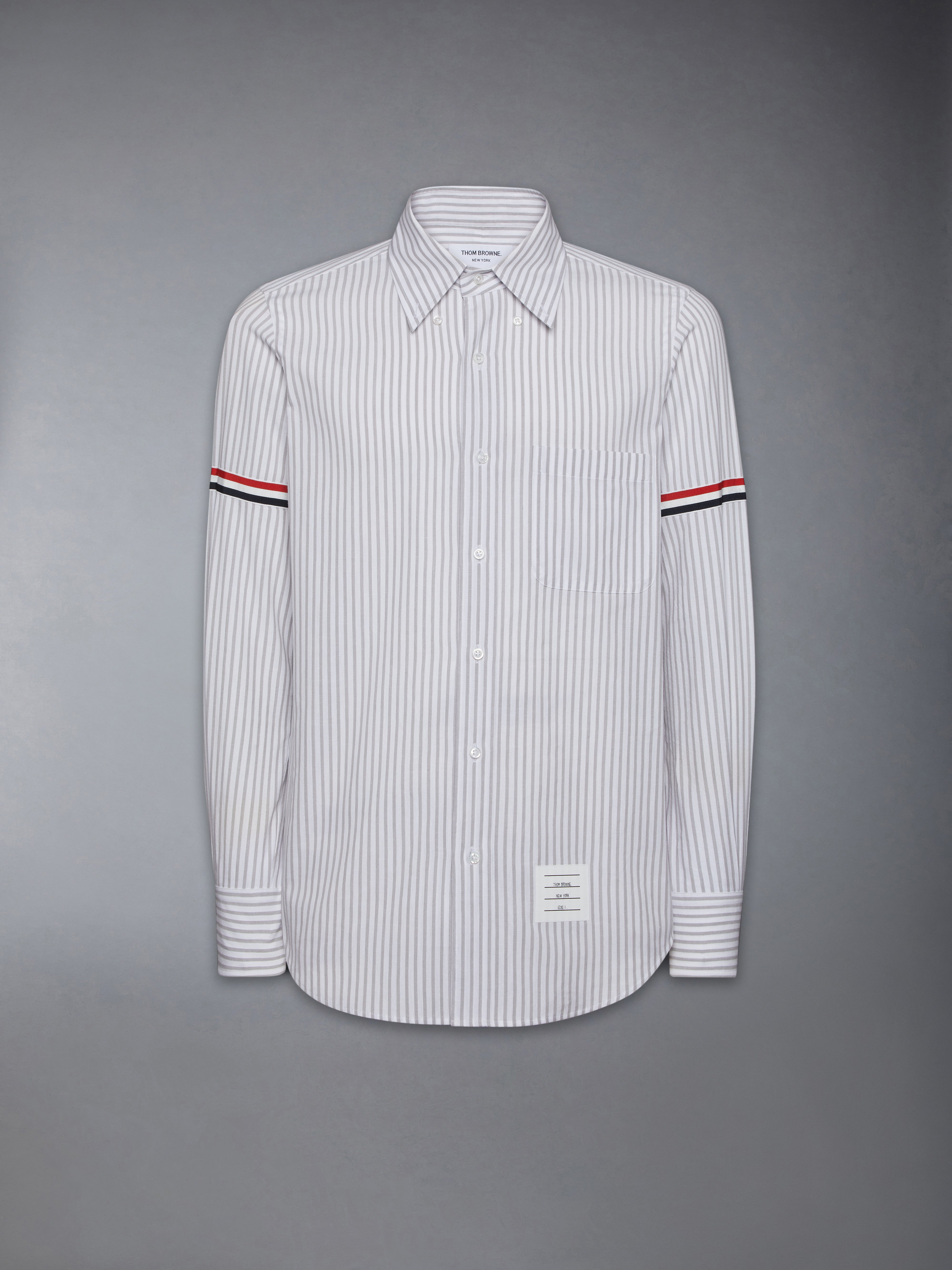 DETAILS & FIT An elevated shirt enriched with signature Thom Browne emblems. Front button closure Chest patch pocket Nametag applique Grosgrain armbands Pleated back yoke with locker loop Signature striped grosgrain loop tab Model is 6'1" (185cm), wearing size 1 100% Cotton Made in Italy MWL301O-F0810-035