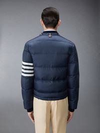 Navy Bomber Jacket Nylon Matte Finish Down-Filled Snap Closure 2 Welt Pockets Detachable Hood Contrast 4-Bar Stripe Signature Grosgrain Loop Tab Model is 6'1"; (186 cm), wearing size 0. MJD061X-05411-415