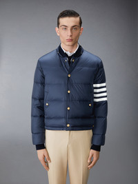 Navy Bomber Jacket Nylon Matte Finish Down-Filled Snap Closure 2 Welt Pockets Detachable Hood Contrast 4-Bar Stripe Signature Grosgrain Loop Tab Model is 6'1"; (186 cm), wearing size 0. MJD061X-05411-415