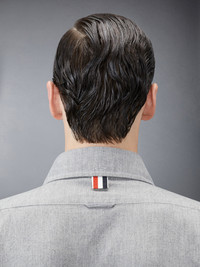 DETAILS & FIT A Thom Browne essential, our Chambray 4-Bar Shirt exhibits quality craftsmanship and meticulous tailoring. Front button closure Button down point collar patch chest pocket 4-bar stripe detail at left sleeve Pleated Buttoned cuffs Name tag applique above rounded hem Pleated back yoke with locker loop Signature striped grosgrain loop tab at back of neck Model is 6' 1" (185cm), wearing size 1 100% Cotton Made in Italy MWL272E-00111-035 - CHEST: 116.0cm - SLEEVE LENGTH: 88.0cm - Shoulder Width: 39.0cm - WAIST: 109.0cm