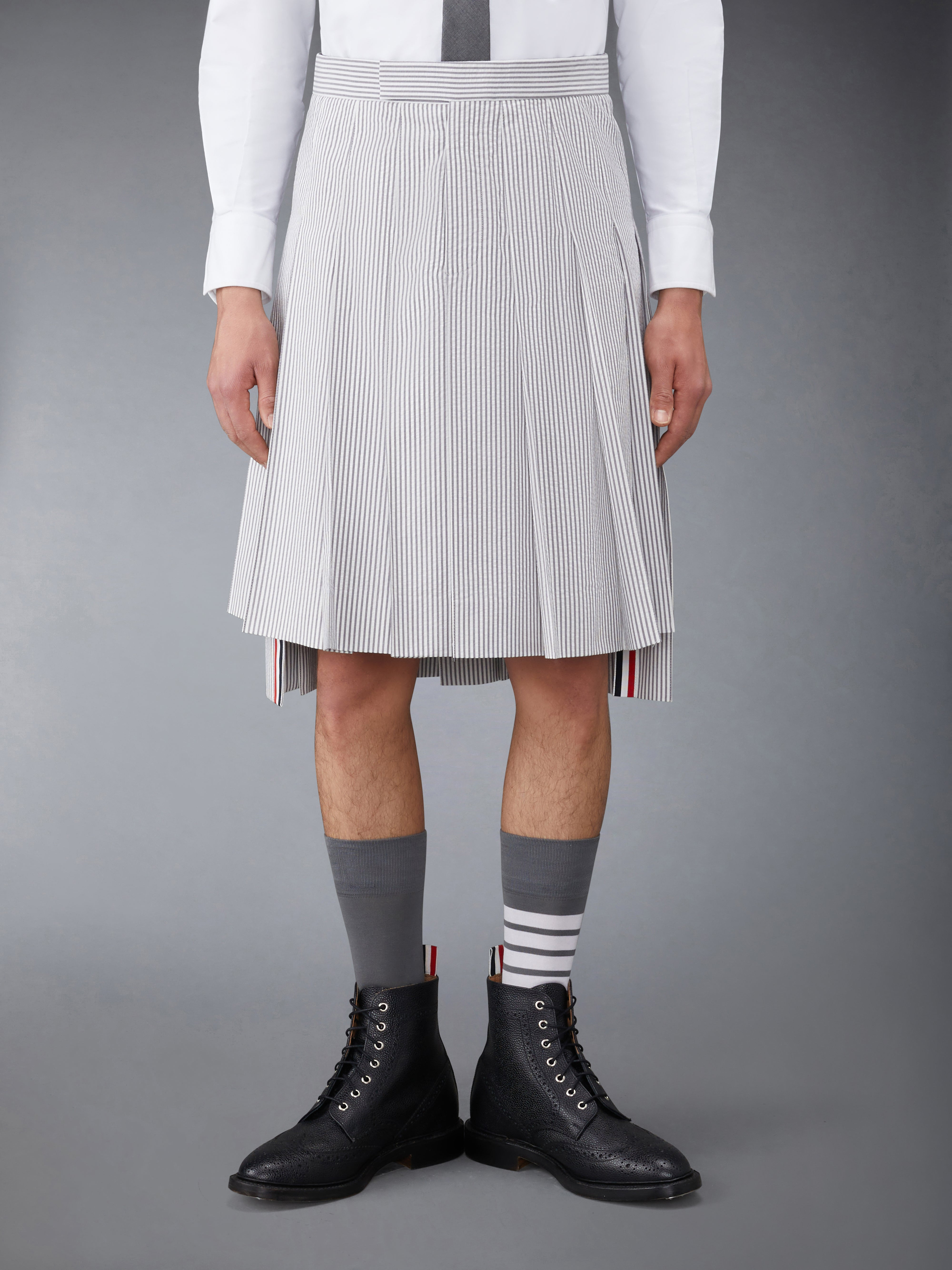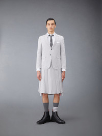 DETAILS & FIT Inspired by East Coast preppy icons but reimagined with inventive proportions and quality craftsmanship, our Classic Seersucker Pleated Skirt is a bold summer staple. Tab closure Dropped back hem with signature striped grosgrain trim Adjustable buttoned backstrap Signature striped grosgrain loop tab at back waist ClassicFit 1 Model is 6' 1" (185cm), wearing size 0 100% Cotton Made in Italy MGC019A-00572-035