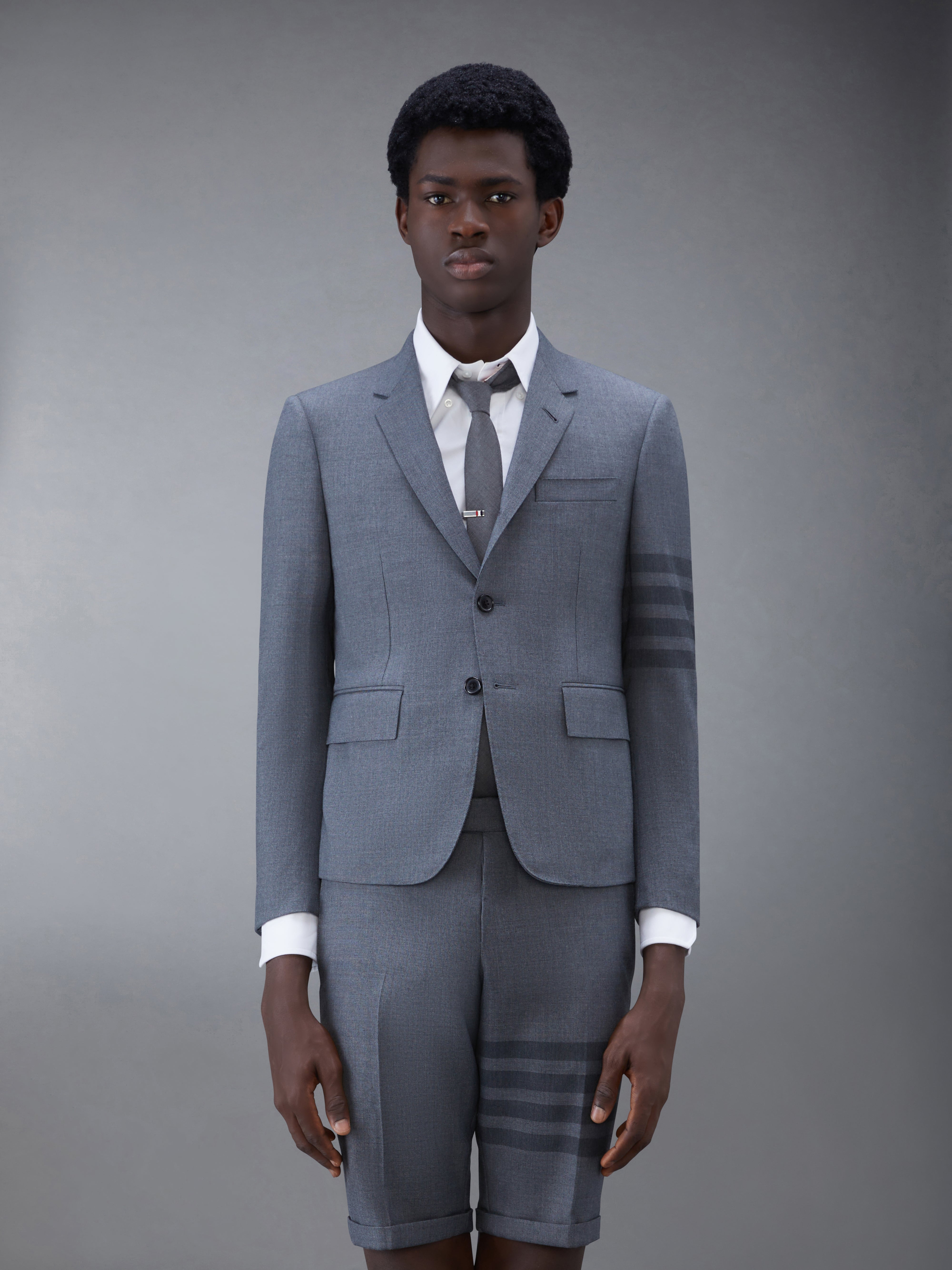 DETAILS & FIT At Thom Browne, uniformity is novel. Our School Uniform Slim Fit Sport Coat reinvents the grey suit with a slim fit taken from punk influences, and tailoring indicative of quality craftsmanship. Front button closure Notched lapels 3 flap front pockets Single chest pocket Buttoned cuffs with signature striped grosgrain trim Double back vent Striped lining with interior pocket and name tag Signature striped grosgrain loop tab at back of neck High ArmholeFit 3 Model is 6' 1" (185cm), wearing size 0 50% Wool, 50% Polyester Lining: 100% Cupro Made in Italy MJC159A-04346-035