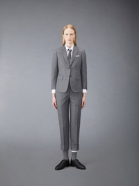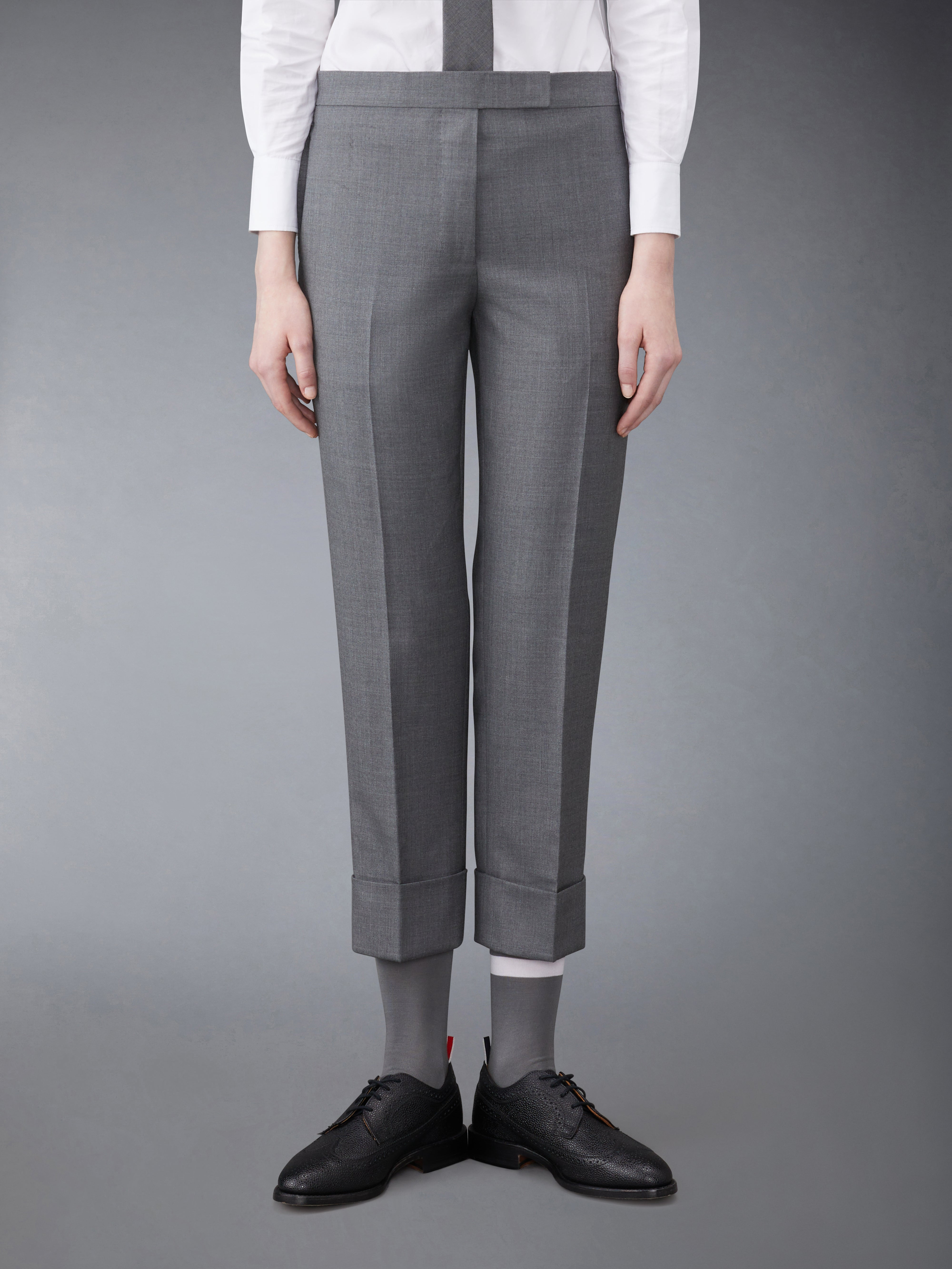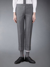 DETAILS & FIT Our Classic Twill Backstrap Trouser. The classic shortened hem pays homage to Thom Browne’s distinguished tailoring. Tab front closure Creased legs Wide cuffs Slip side pockets Button-fastening jetted hip pockets Notched back waist Signature striped grosgrain loop tab at back waist ClassicFit 1 Model is 5' 10" (178cm), wearing size 40 100% Wool Lining: 100% Cupro Made in Italy FTC337A-00626-035