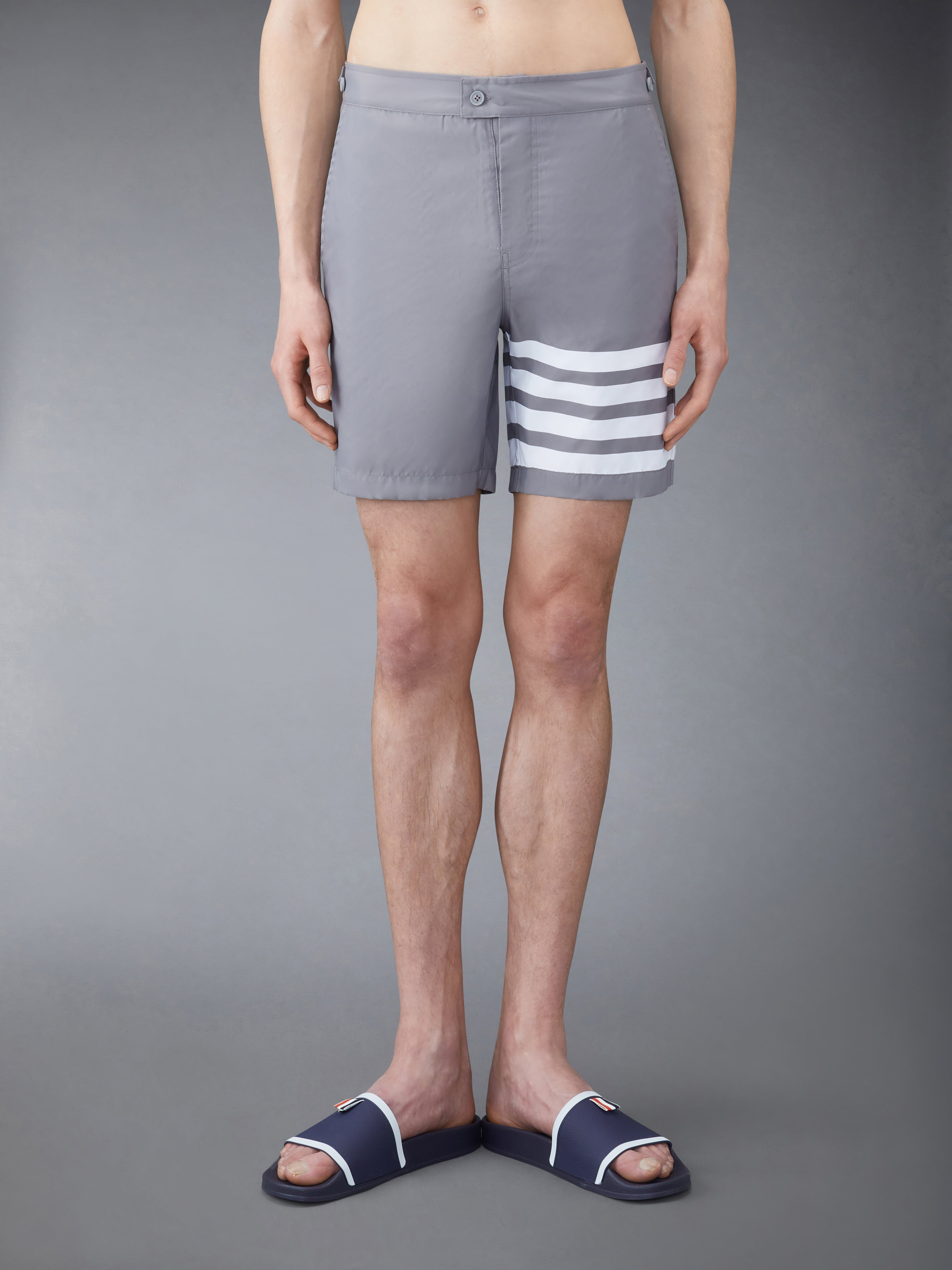 DETAILS & FIT Swimwear made artful. Our Swim Tech 4-Bar Board Shortsis equipped with sleek hip pockets and a button waist. Button closure 4-bar stripe detail at left thigh Slip side pockets Button-fastening jetted hip pockets Signature striped grosgrain loop tab at back waist Model is 6' 1" (185cm), wearing size 0 94% Polyamide, 6% Polyurethane Made in Italy MTT027A-07538-035