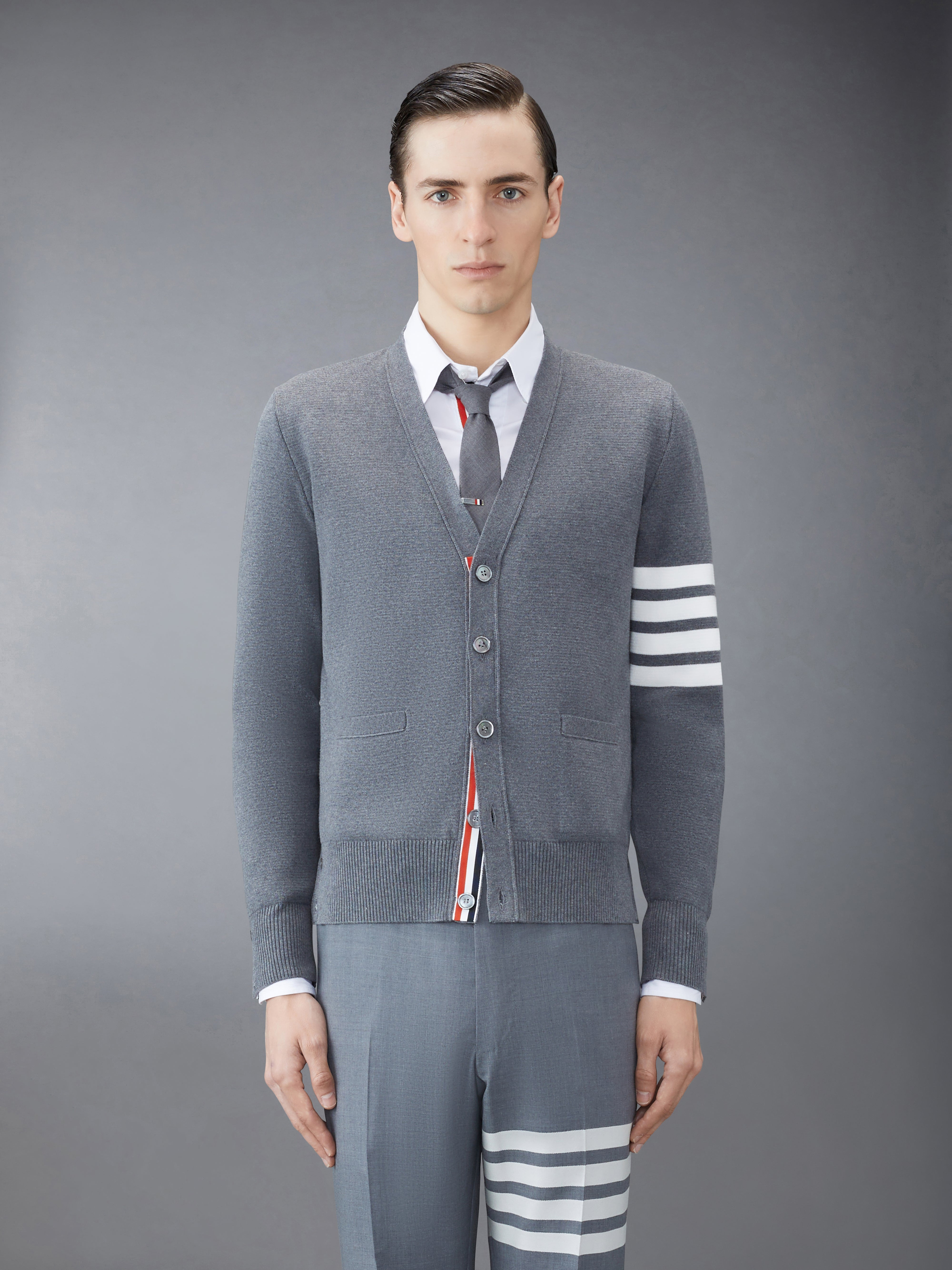 DETAILS & FIT Two Thom Browne emblems define our Cotton Crepe V-neck Cardigan—grosgrain trim and 4-Bar stripe detailing, both synonymous with the brand. V-neckline Front button closure with striped grosgrain placket 4-bar stripe detail at left sleeve Buttoned side vents and cuffs with signature striped grosgrain trim Signature striped grosgrain loop tab at back of neck Buttoned side vents and cuffs with signature striped grosgrain trim Center stripe through back and hood Model is 6' 1" (185cm), wearing size 1 100%Cotton Made in Italy MKC171A-00219-035