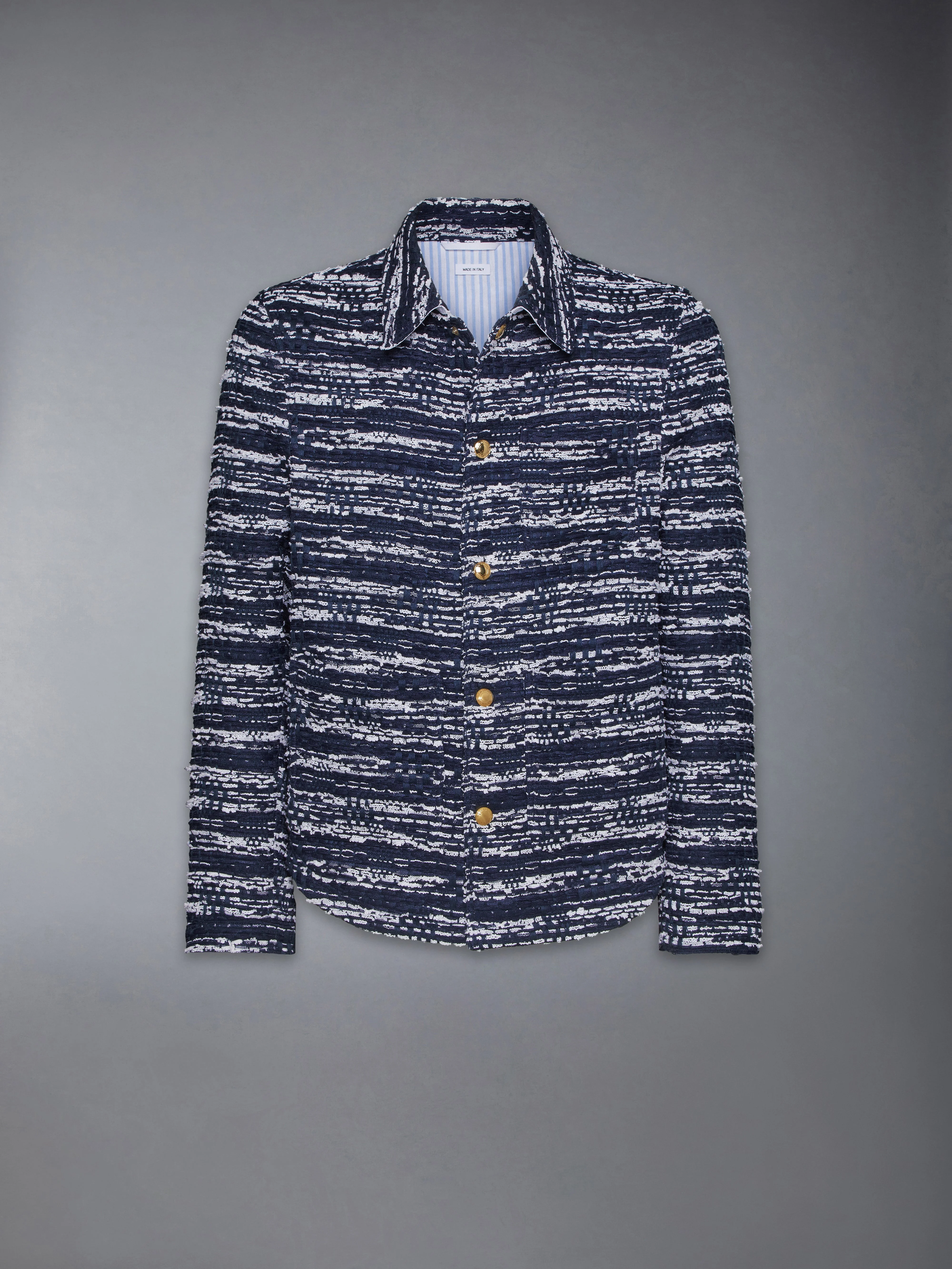 DETAILS & FIT A blend of timeless elegance and innovative craftsmanship, this statement-making jacket is more than just everyday wear—it's a conversation piece. Our melange tulle yard tweed is made using eight different yarns. Front button closure 3 Front patch pockets Interior pocket with name tag Signature striped grosgrain loop tab Model is 6'1" (185cm), wearing size 1 42% Acrylic, 39% Polyamide, 14% Cotton, 5% Polyester Lining: 100% Cotton Lining 2: 100% Cupro Made in Italy MJO220A-F0827-415