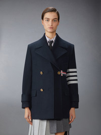 Crafted for durability and cold weather, this heavy-felted jacket embodies signature Thom Browne tailoring with narrow shoulders. Refined gold buttons embossed with the Thom Browne insignia add a touch of elegance, while our iconic 4-bar stripes provide a distinct finishing touch. Designed with a double-layered construction, the inner layer functions as a standalone vest, offering a versatile 2-in-1 design that adapts effortlessly to shifting temperatures. Withstand the elements in true Thom Browne style. Double breasted front button closure with striped grosgrain bow 4-bar detailing Interior pocket with name tag Signature striped grosgrain loop tab Model is 5'10" (178 cm), wearing size 40 95% Wool, 5% Cashmere Lining: 100% Cupro Made in Italy FOC888A-F0522-415