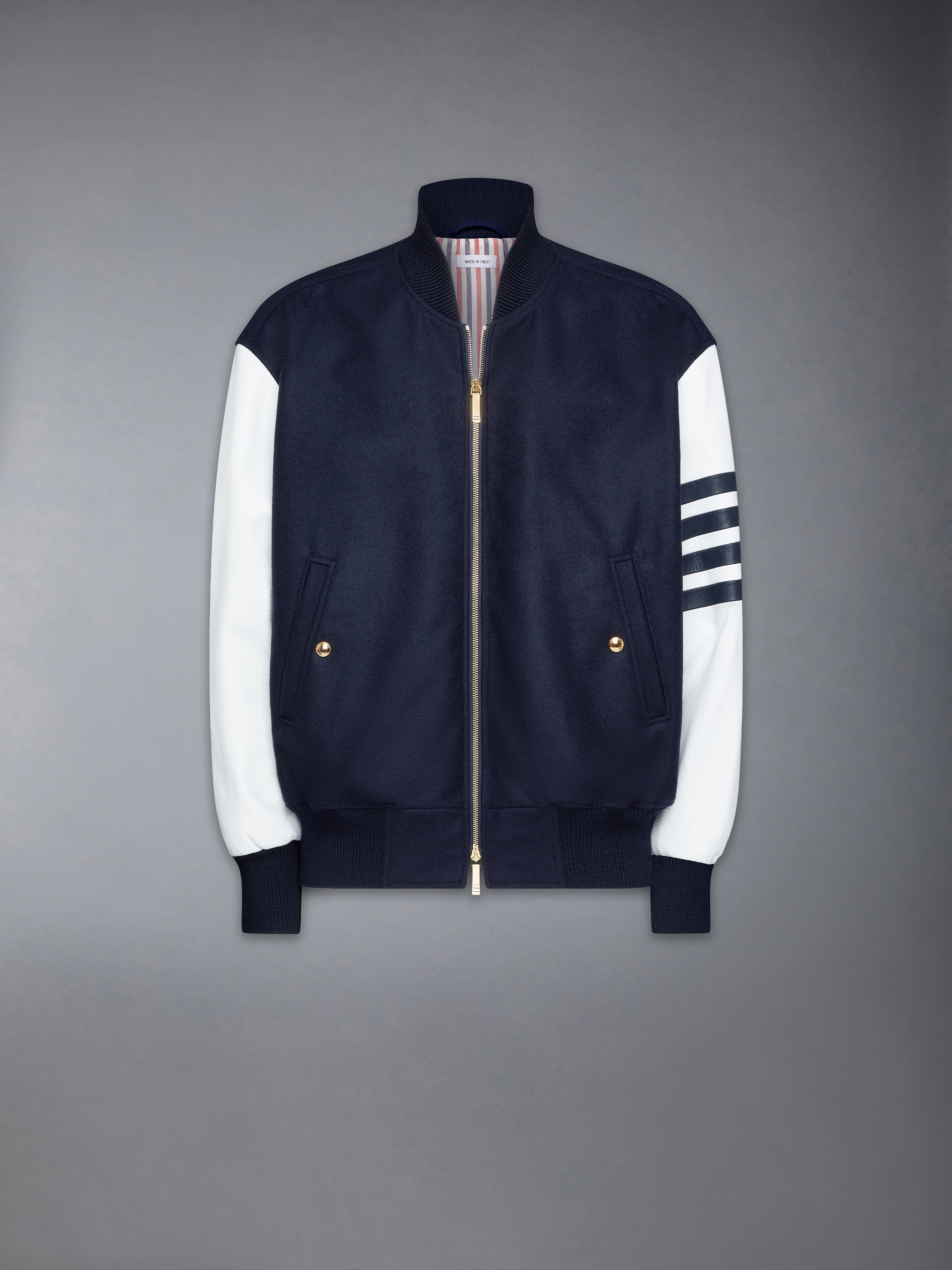 Oversized blouson jacket in navy Melton wool with contrast lamb leather sleeves and 4-bar stripe detail at left sleeve in navy. 2-way zip closure, snap-fastening slant pockets. Rib knit collar, cuffs, and hem. Striped lining with interior pocket and name tag. Signature striped grosgrain loop tab at back of neck. Model is 6' 1"; (185mm), wearing size 0. 60% Wool, 40% Lamb Leather Made in Italy MJO161X-05507-415