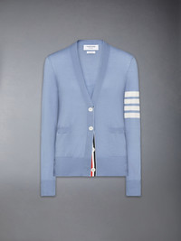 Two Thom Browne emblems define our Wool 4-Bar V-neck Cardigan — grosgrain trim and 4-Bar stripe detailing, both synonymous with the brand. Presented in fine virgin merino wool fabric, this roomy cardigan exudes sophistication. V-neck Front button closure with striped grosgrain placket 4-bar stripe detailing Buttoned side vents and cuffs with signature striped grosgrain trim Signature striped grosgrain loop tab at back of neck Model is 5' 10" (178cm), wearing size 40 100% Virgin Wool Made in Italy FKC334A-Y1014-482
