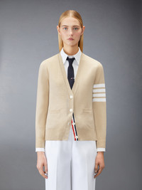 Two Thom Browne emblems define our Wool 4-Bar V-neck Cardigan — grosgrain trim and 4-Bar stripe detailing, both synonymous with the brand. Presented in fine virgin merino wool fabric, this roomy cardigan exudes sophistication. V-neck Front button closure with striped grosgrain placket 4-bar stripe detailing Buttoned side vents and cuffs with signature striped grosgrain trim Signature striped grosgrain loop tab at back of neck Model is 5' 10" (178cm), wearing size 40 100% Virgin Wool Made in Italy FKC334A-Y1014-260
