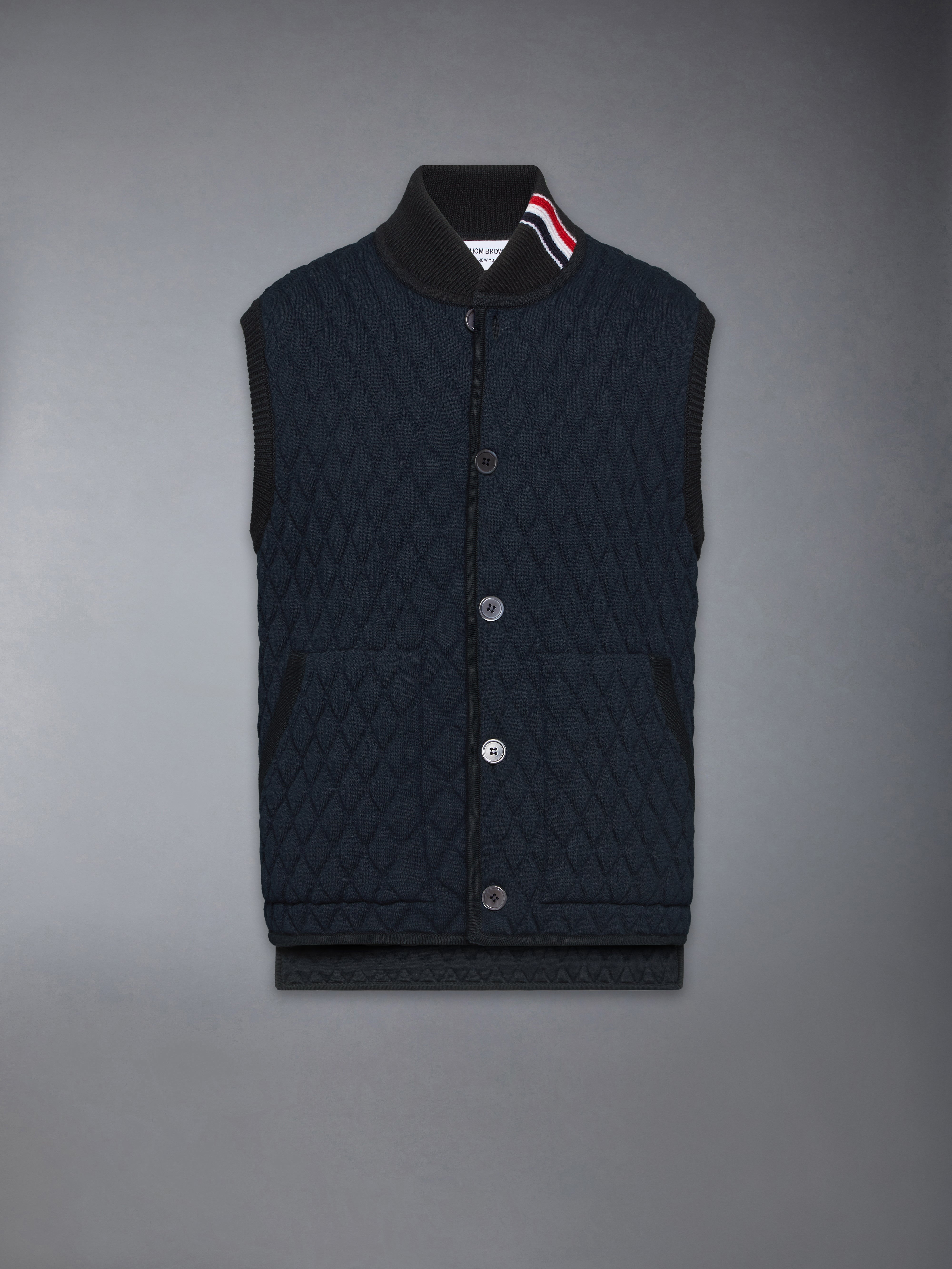 Quiet luxury at its finest. This vest blends understated elegance with practical warmth. Finished with our signature tricolor trim at the collar. Front button closure Side slip pockets Side vents Tricolor trim at color Signature striped grosgrain loop tab Model is 6'1" (185cm), wearing size 1 70% Virgin Wool, 28% Polypropylene, 2% Polyamide Made in Italy MKV093A-Y1029-415