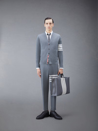 DETAILS & FIT Two Thom Browne emblems define our Wool 4-Bar V-neck Cardigan —grosgrain trim and 4-Bar stripe detailing, both synonymous with the brand. Presented in fine merino fabric, this cardigan exudes sophistication. V-neckline Front button closure with striped grosgrain placket 4-bar stripe detail at left sleeve Buttoned side vents and cuffs with signature striped grosgrain trim Signature striped grosgrain loop tab at back of neck Model is 6' 1" (185 cm), wearing size 0 100% Virgin Wool Made in Italy MKC160A-00014-035