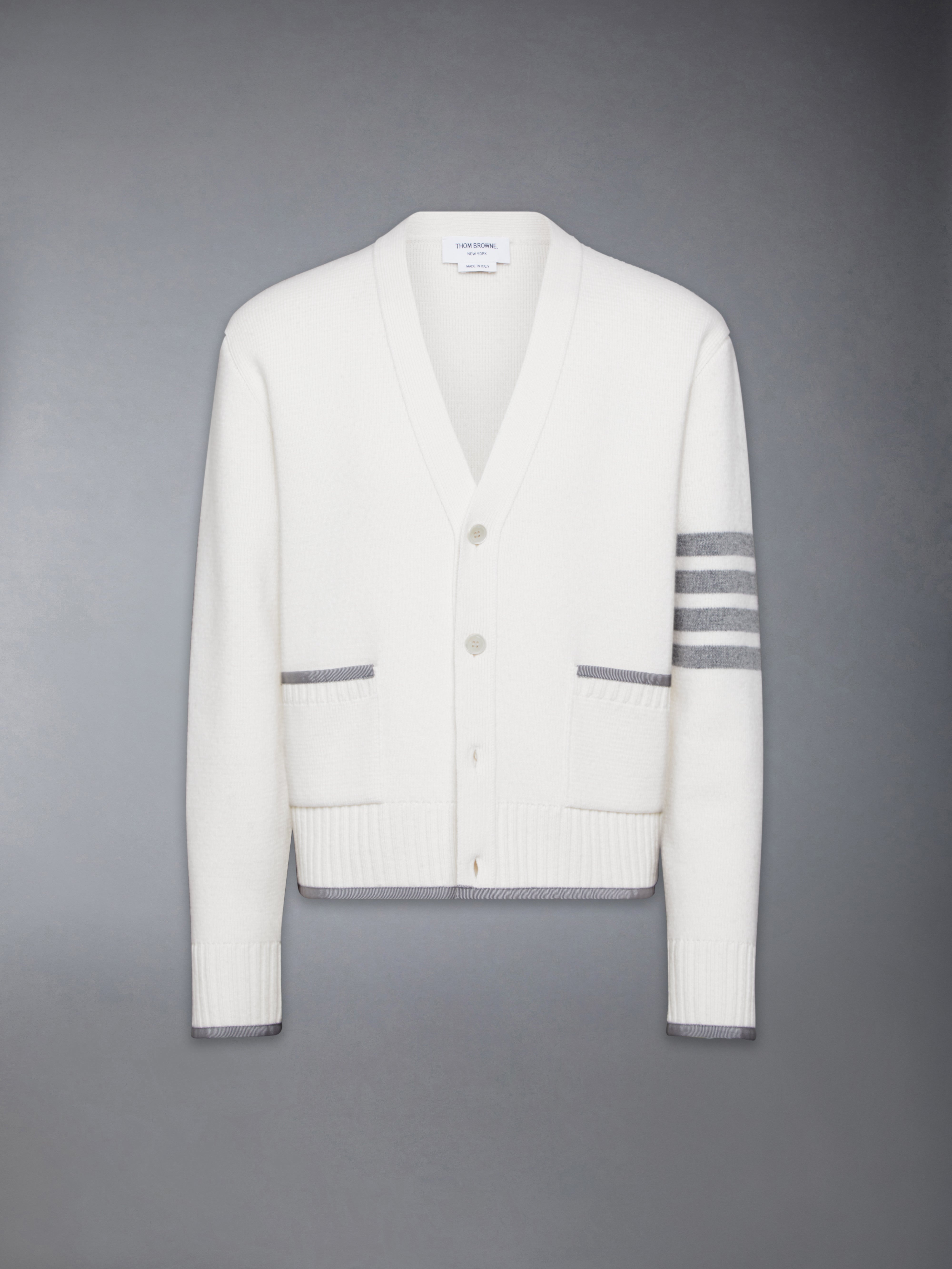 This luxuriously soft cardigan is thoughtfully crafted from fine merino wool. It features signature striped grosgrain trim at the cuffs and side vents, and our beloved 4-bar detailing. Equipped with convenient pockets for carrying your essentials. Front button closure 4-bar detailing 2 Front patch pockets Buttoned cuffs with signature striped grosgrain trim Buttoned side vents with signature striped grosgrain trim Signature striped grosgrain loop tab Model is 6'1" (185cm), wearing size 1 100% Virgin Wool Made in Italy MKC608A-Y1029-100