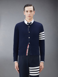 DETAILS & FIT A signature Thom Browne emblem defines our Classic Cashmere 4-Bar Crew Neck Cardigan. Presented in 100% rich cashmere, this cardigan is a longstanding staple. Front button closure with striped grosgrain placket 4-bar stripe detail at left sleeve Buttoned side vents and cuffs with signature striped grosgrain trim Signature striped grosgrain loop tab at back of neck Model is 6' 1" (185cm), wearing size 1 100% Cashmere Made in the UK MKC314A-00011-415