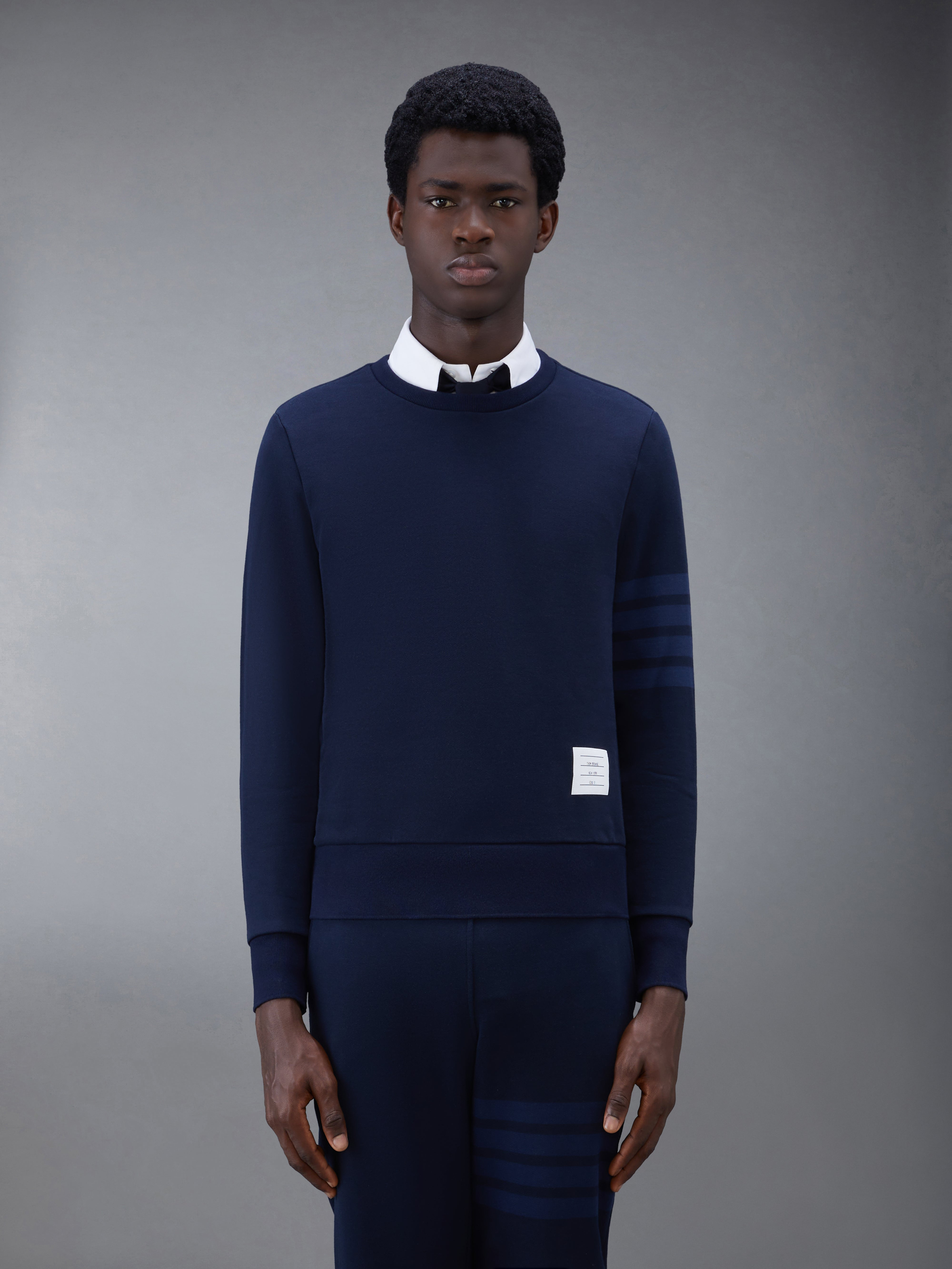 Navy Cotton Loopback Relaxed Fit Tonal 4-Bar Crewneck Sweatshirt