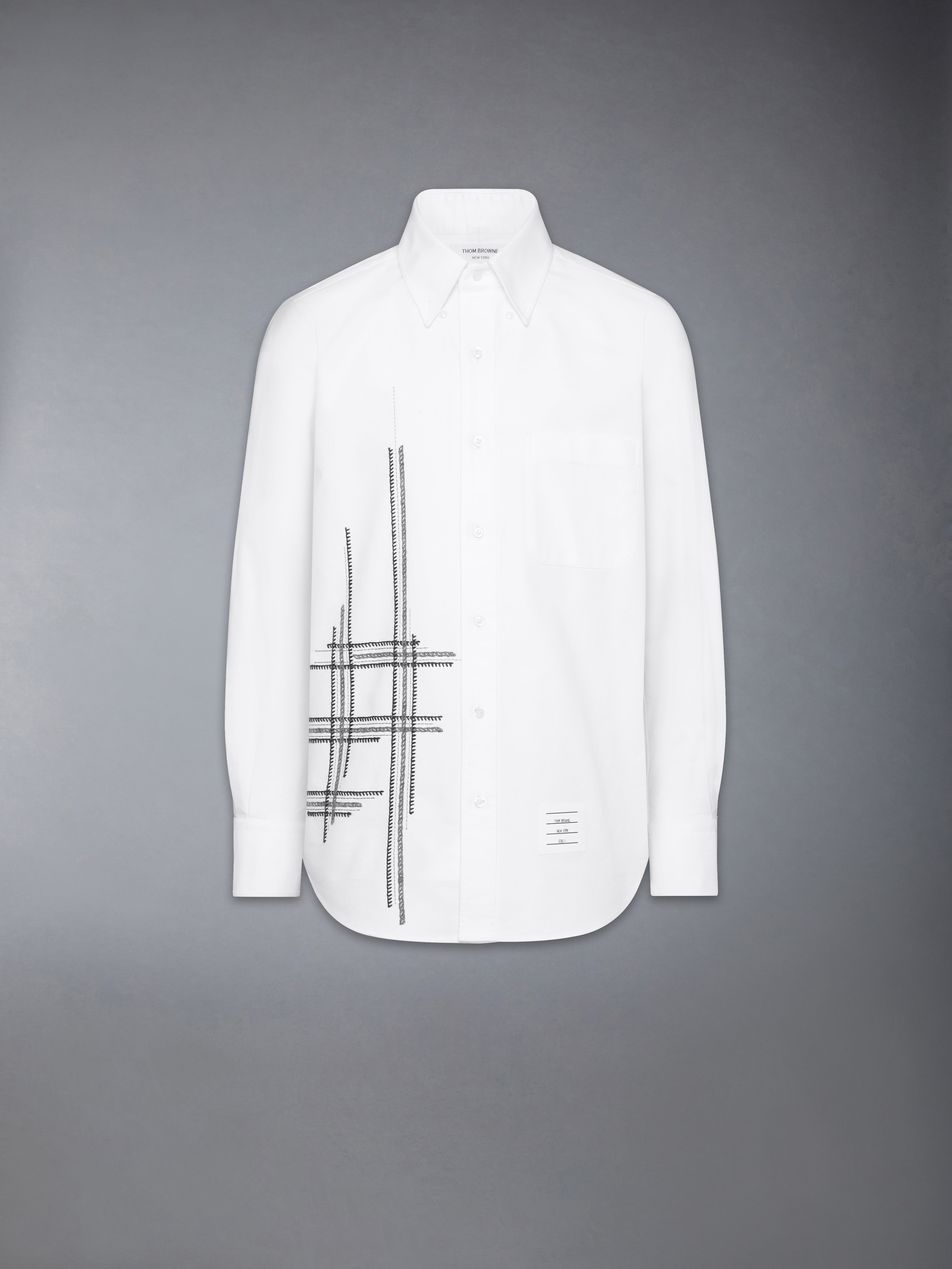 In every stitch lies a story. Blanket and chain stitching form incomplete boxes—evoking cages and the act of breaking free. A metaphor for shedding constraints and stepping into individuality, this shirt is as symbolic as it is luxurious, crafted with meticulous Thom Browne tailoring and breathable Oxford fabric. Pair it with our Low Rise Wool School Uniform Trousers. Front button closure Chest patch pocket Name tag applique Pleated back yoke with locker loop Signature striped grosgrain loop tab Straight fit Model is 6'1" (185cm), wearing size 1 100% Cotton Combo 1: 100% Wool Made in Italy MWL272E-E1402-100