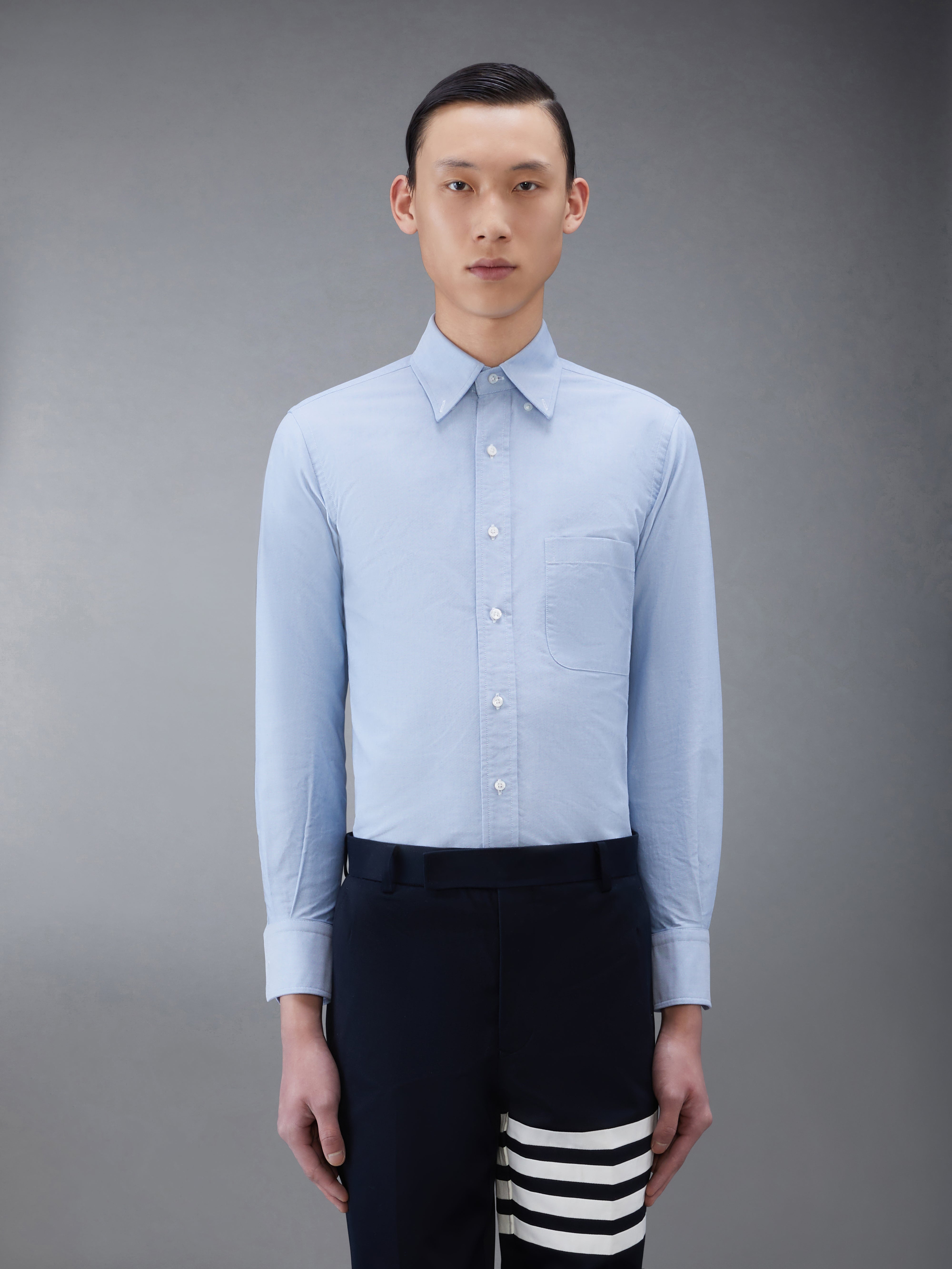 A Thom Browne essential, our Oxford Classic Point Collar Shirt exemplifies Thom Browne's signature inventive proportions and quality craftsmanship. Front button closure Button down point collar Patch chest pocket Name tag applique above curved hem Buttoned cuffs Signature striped grosgrain loop tab at back of neck Model is 6' 1" (185cm), wearing size 1 100% Cotton Made in Italy MWL001A-F0313-480