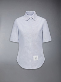Effortless style meets sophistication with this classic Round Collar Oxford Short Sleeve Shirt, featuring signature Thom Browne emblems throughout. Pair it with one of our signature trousers. Front button closure Front patch pocket Name tag applique above hem Pleated back yoke with locker loop Signature striped grosgrain loop tab Model is 5'10" (178 cm), wearing size 40 100% Cotton Made in ITALY FLL206A-02188-415