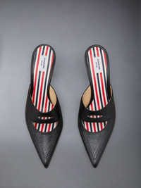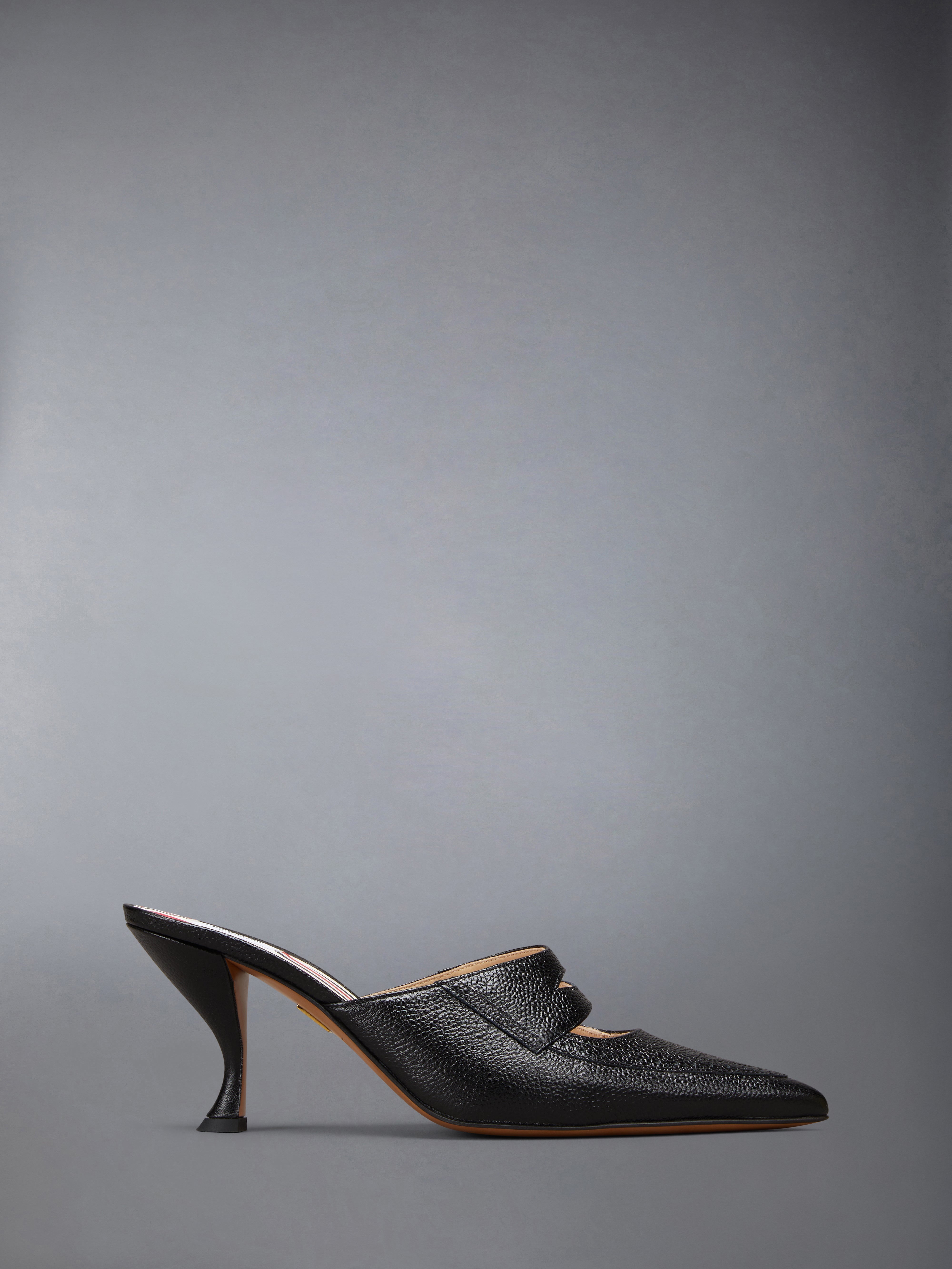 Heeled penny loafer mule in pebble grain leather with cut outs details. 75mm curved heel with rubber cap. Striped insole. Leather sole. Upper:100% Calf Leather Sole:100% Calf Leather; Made in Italy FFH256A-06257-001