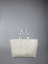 Inspired by traditional tool bags, this medium tote brings a utility-driven silhouette into the Thom Browne world. Crafted in pebble grain leather, it features a structured base and a perforated Hector motif that adds charm to function. RWB grosgrain trims finish the design with signature precision—structured, playful, and ready for daily use. Top snap closure Top handles RWB grosgrain detail Reinforced bottom panel Interior zip pocket Tricolor lining Perforated Hector motif Signature striped grosgrain loop tab 100% Calf Full Grain Leather Lining: 100% Polyester Made in Italy UAG259A-00198-250