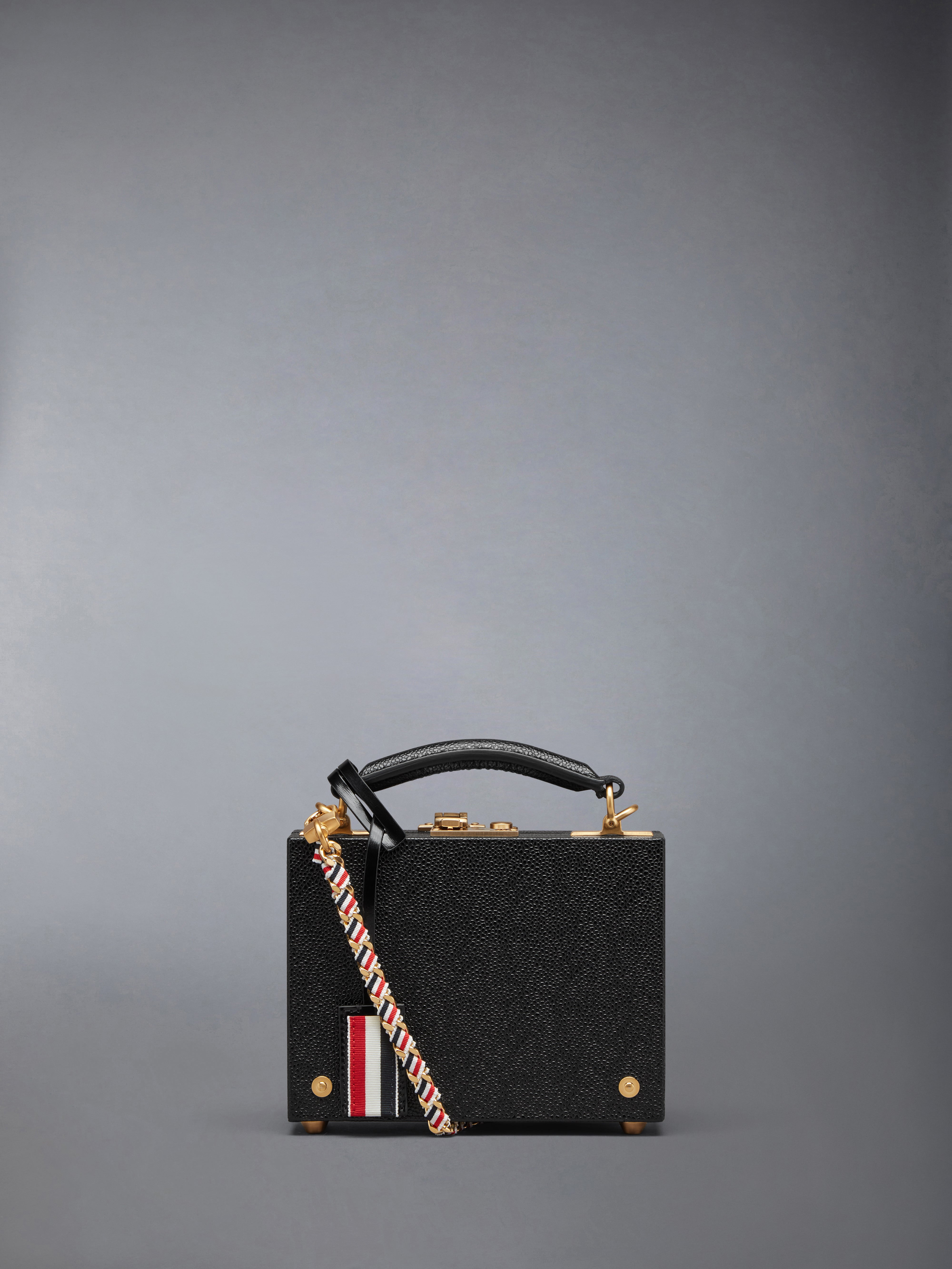 Micro attache case in pebble grain leather with removable woven brass chain and grosgrain ribbon shoulder strap. Locking brass clasp, tweed-covered top handle, striped leather luggage tag. Brass riveted and footed details. Striped lining with interior pocket. Brass hardware. 100% Calf Full Grain Leather Lining: 68% Polyester Recycled, 27% Polyester, 5% Acrylic Made in Italy FAP191A-00198-001