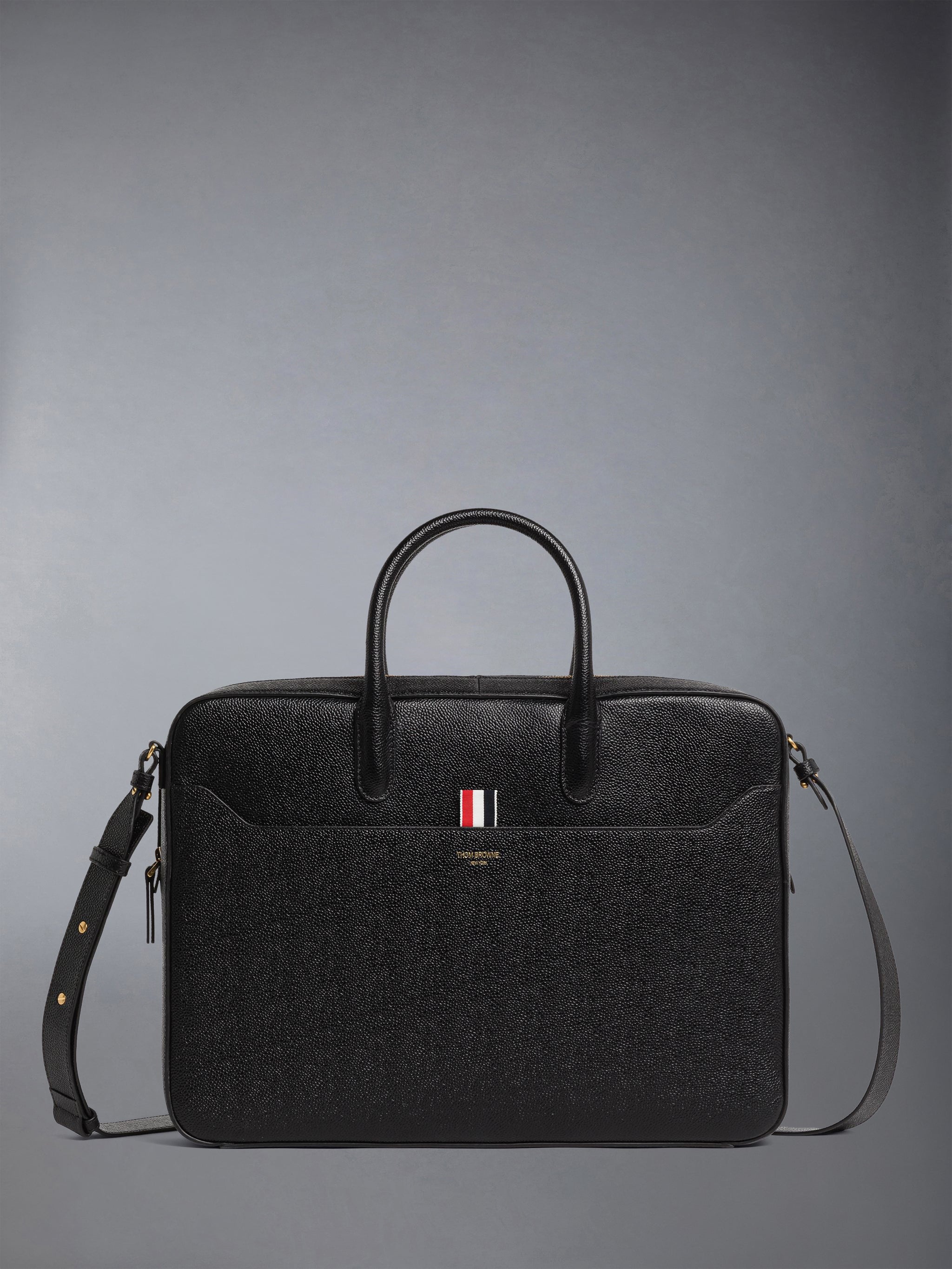 Business bag in grey pebble grain leather with removable adjustable shoulder strap. 2-way brass zip closure, rounded double leather top handle, slip front pocket. Gold foil printed logo and signature striped grosgrain loop tab at front pocket entry. 100% Calf Full Grain Leather Lining: 100% Polyester Made in Italy MAG410A-00198-001