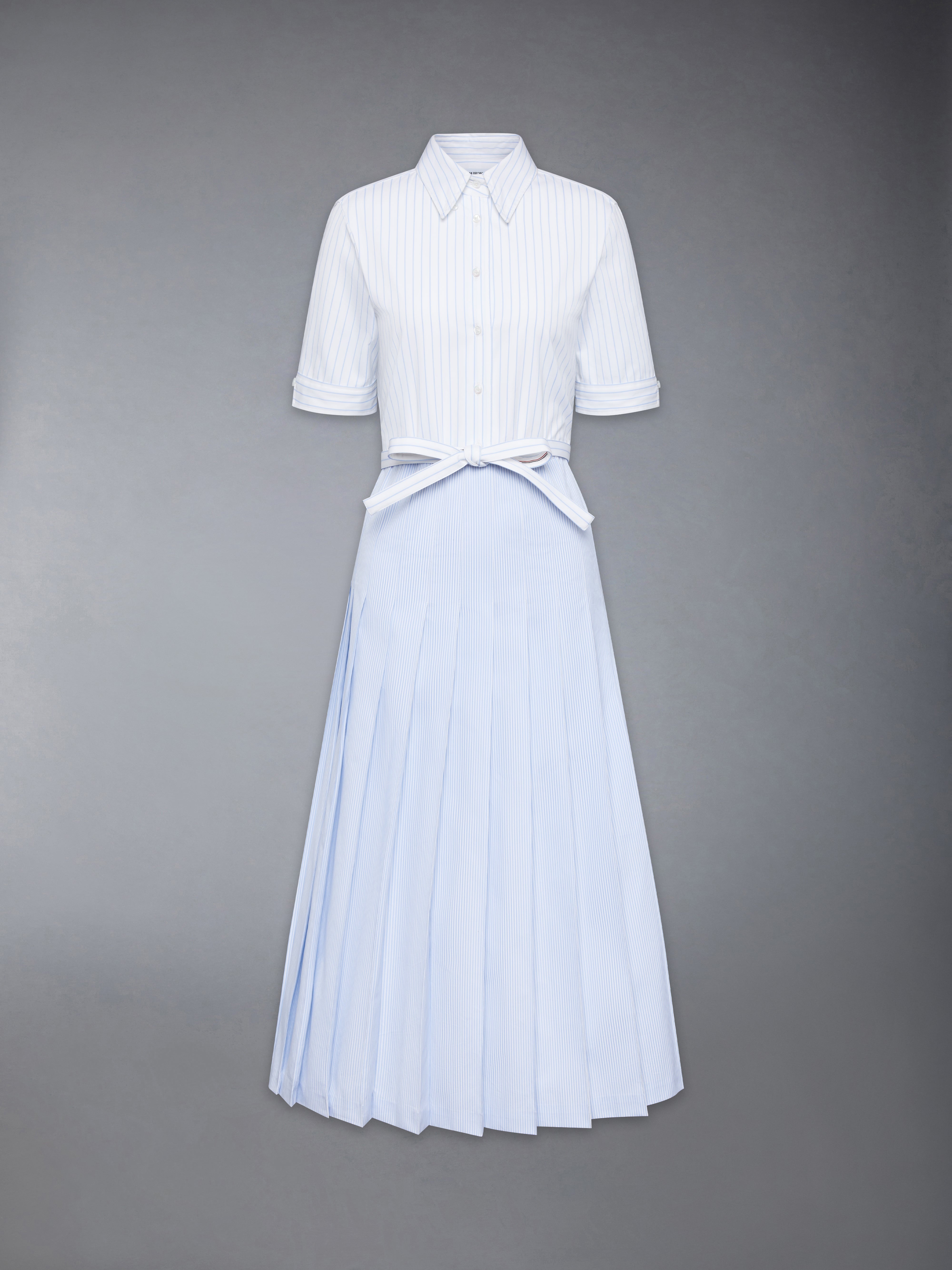 PINSTRIPE POPLIN BELTED PLEATED SHIRTDRESS
