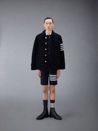 Our Plain Weave 4-Bar Low Rise Shorts embraces a slim fit taken from punk influences while remaining true to Thom Browne's classic heritage. Plain weave suiting Tab closure Creased legs Narrow cuffs 4-bar stripe detail at left thigh Adjustable buttoned side tabs with signature striped grosgrain trim Slip side pockets Button fastening back welt pockets Signature striped grosgrain loop tab at back waist Low Rise - Fit 3 Model is 6' 1" (186cm), wearing size 0 100% Wool Lining: 100% Cupro Made in Italy MTC188A-06146-415