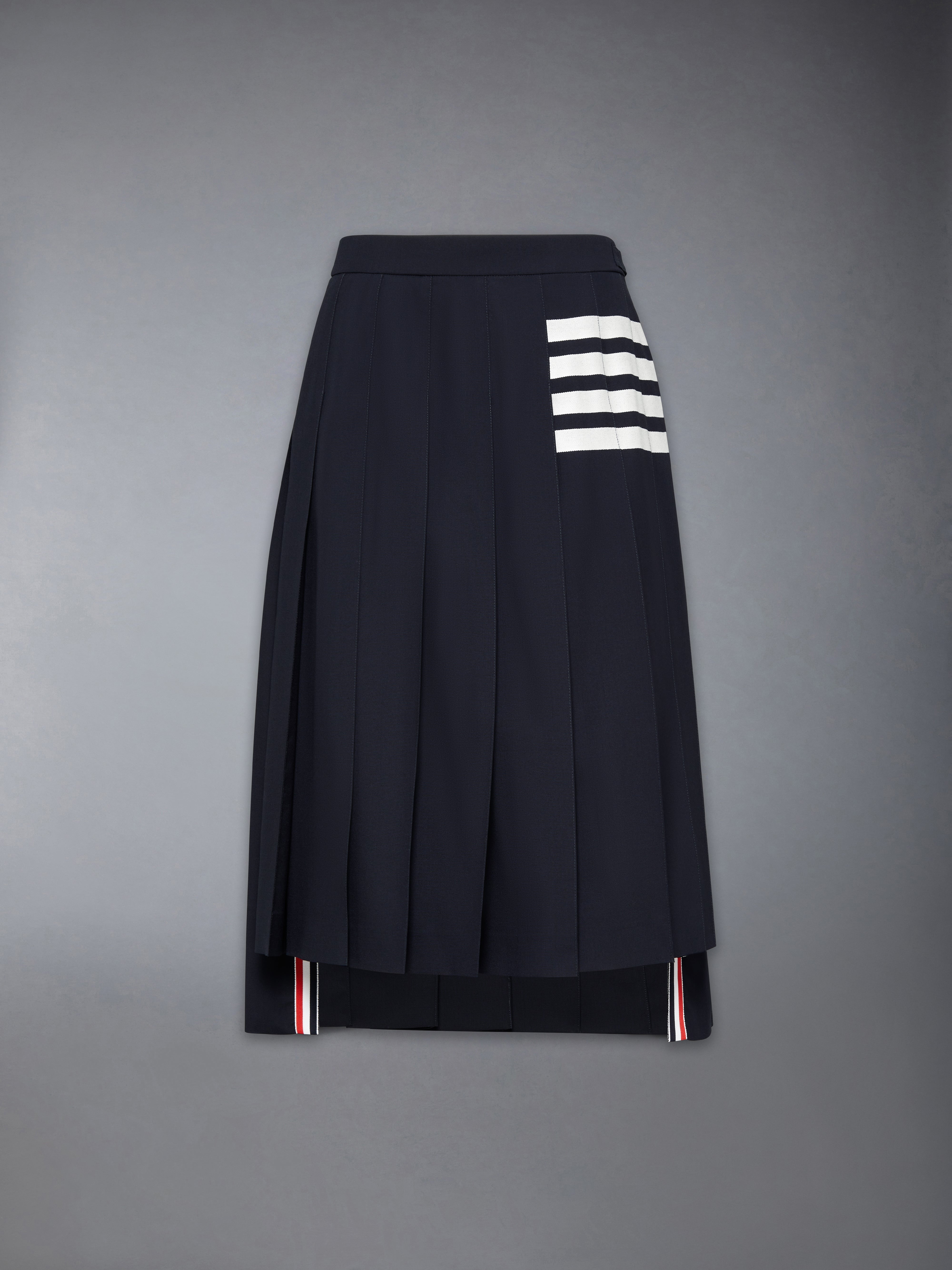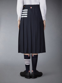 Inspired by East Coast preppy icons but reimagined with inventive proportions and quality craftsmanship, our Plain Weave 4-Bar Below Knee Dropped Back Pleated Skirt is a fresh take on a traditional silhouette. Pair with our leather brogue heels. Engineered 4-bar stripe detail Dropped back hem with signature striped grosgrain trim Adjustable Buttoned side tab closure Signature striped grosgrain loop tab at back waist Model is 5' 10" (178cm), wearing size 40 100% Wool Lining: 100% Cupro Made in Italy FGC400V-06146-415