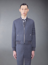 Blouson jacket in grey plain weave suiting with shiny tonal 4-bar stripe detail at left sleeve. Front zip closure, snap fastening welt front pockets. Rib trim at collar, cuffs, and hem. Striped lining with interior pockets and name tags. Signature striped grosgrain loop tab at back of neck. Model is 6' 1" (185cm), wearing size 0. 100% Wool Made in Italy MJO030A-06146-025
