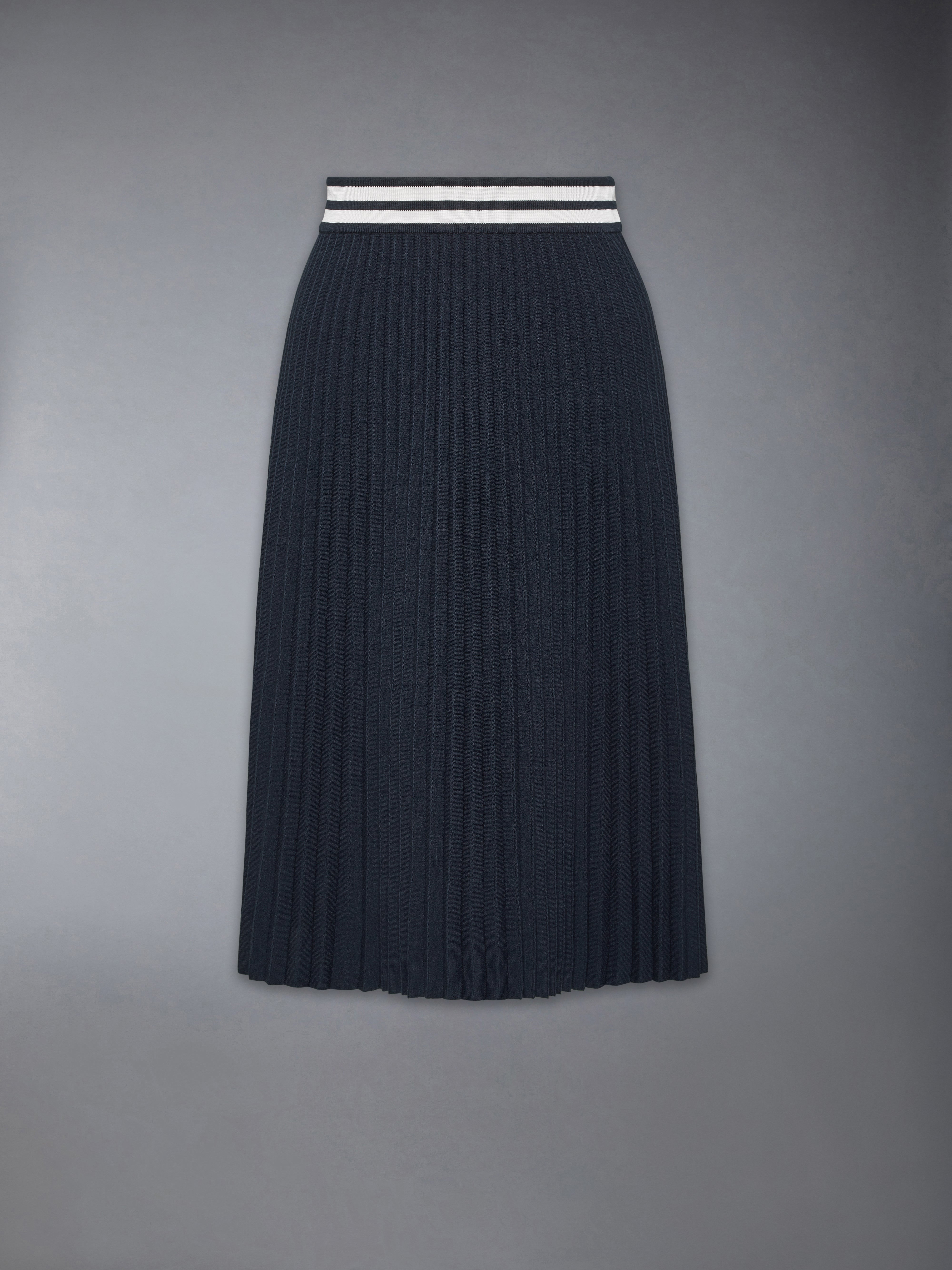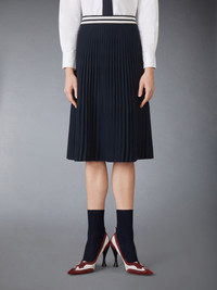 Crisp, classic, and endlessly versatile, this skirt is crafted from a luxurious blend of silk and Merino wool. A contrast waistband accented by signature cricket stripes is a nod to mid-century sports uniforms. Pair it with our Tuck Stitch Silk Cashmere & Wool Elongated V-Neck Cardigan. Pull on Below the knee length Model is 5'10" (178 cm), wearing size 40 87% Wool, 13% Polyester Combo 1: 45% Wool, 6% Polyester, 49% Silk Made in Italy FKK146B-Y4007-415