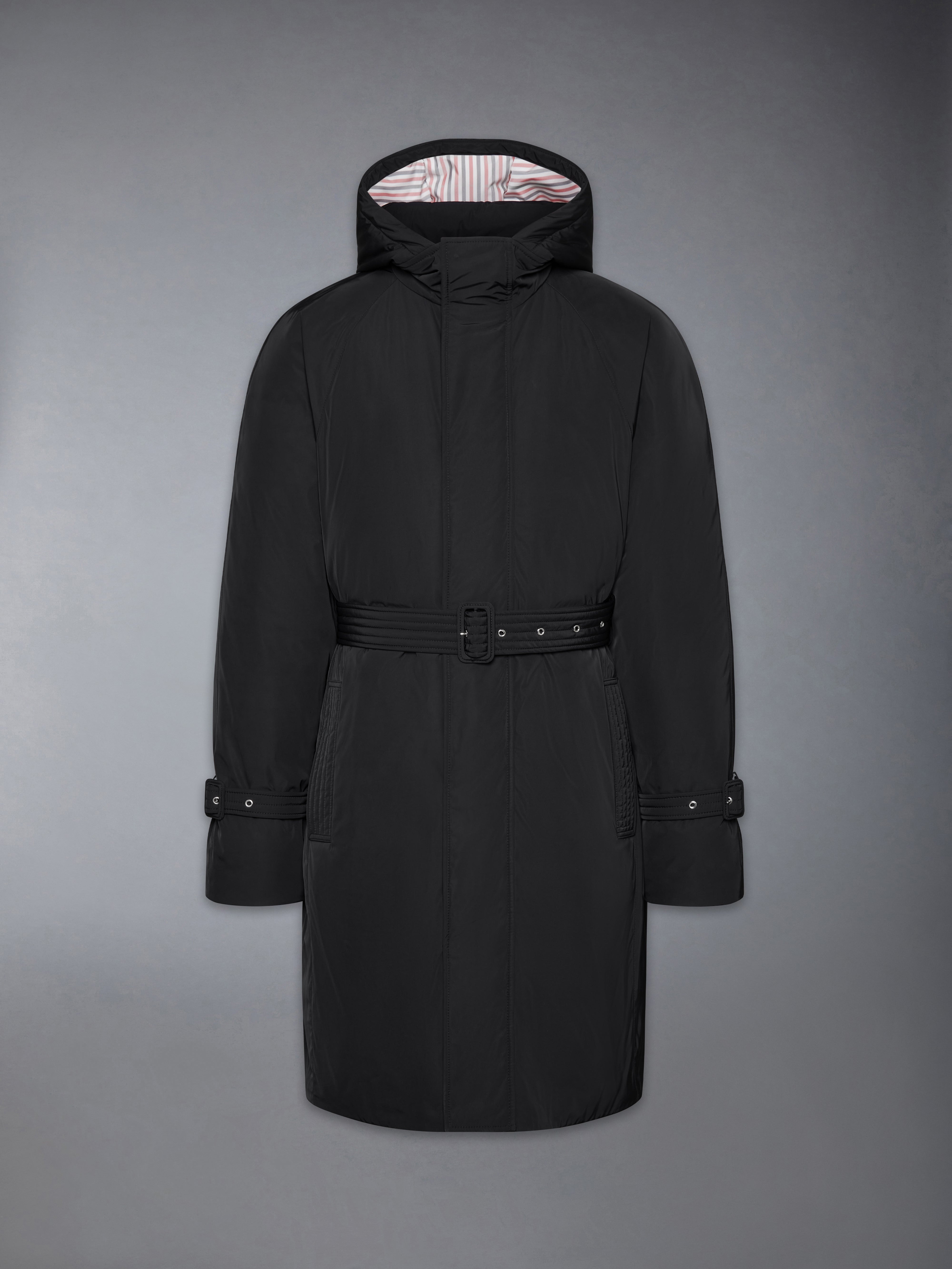 Winter weather calls for the comfort of this signature Thom Browne parka, filled with luxe down and finished with a flattering belted waist and adjustable belted cuffs. Inspired by a trip to Utah, Thom envisioned an elongated silhouette to shield more of the body from unforgiving conditions. Built to last and crafted with Thom's signature attention to detail and quality. Front snap button closure with hidden zipper Side slip pockets 4-bar detailing Belted waist Belted cuffs Removable interior backpack straps Interior pocket with name tag Model is 6'1" (185cm), wearing size 1 100% Polyester Padding: 80% White Goose Down, 20% White Goose Feathers Lining: 100% Polyester Made in Italy MOD092X-07259-001