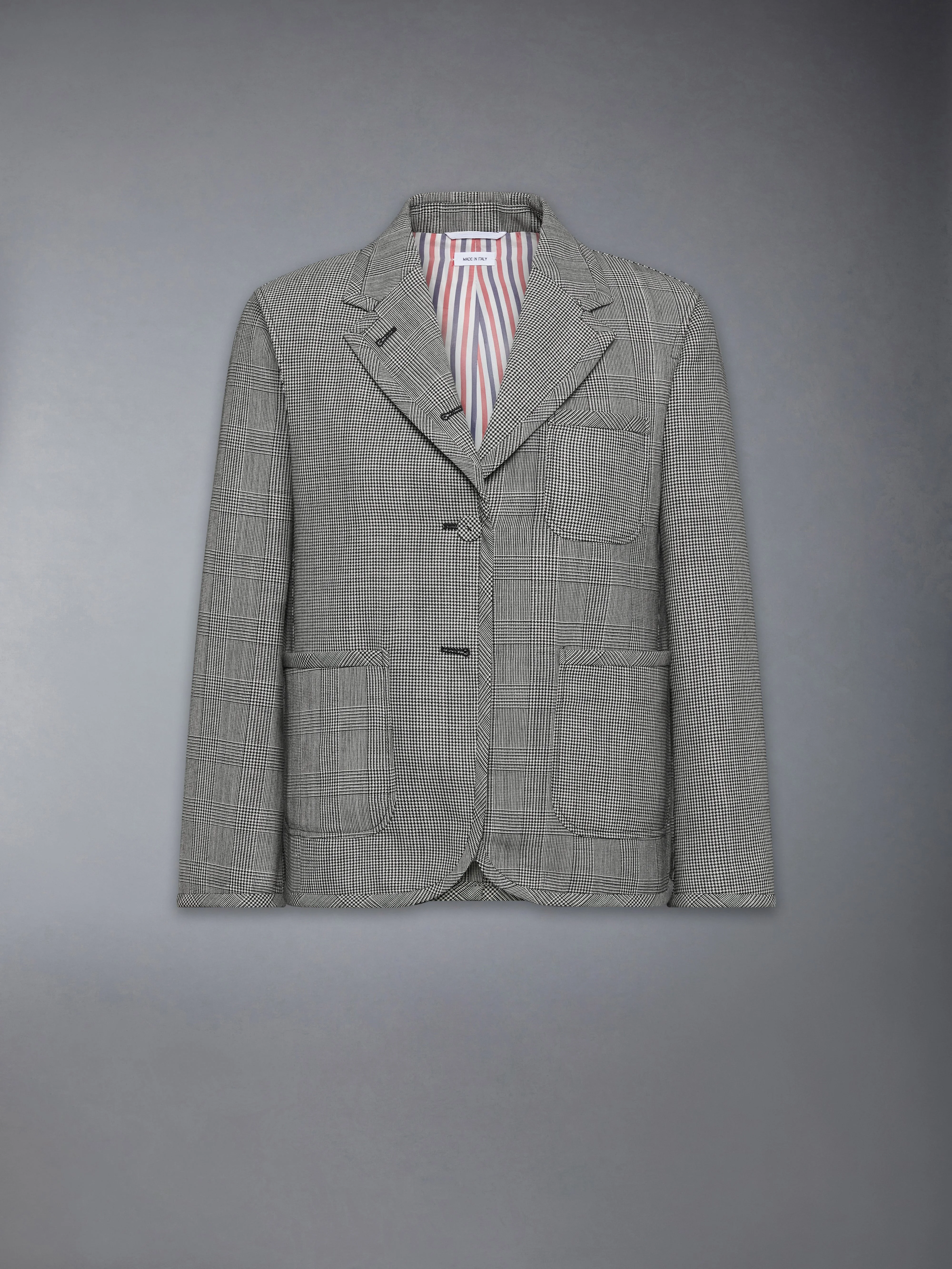 Two classic suiting motifs—houndstooth and Prince of Wales—are brought into visual dialogue in this cropped sack sport coat. The mismatched patterns are framed by self tipping, shifting a formal base toward something more graphic and playful. Pair with the matching Funmix Fresco Wool Pleated Skirt for a studied take on uniform dressing. Front button closure Contrast felt undercollar Patch chest and hand pockets Three interior pockets Tricolor lining Single back vent Signature striped grosgrain loop tab Fit 2 - Sack fit Model is 5'10" (178 cm), wearing size 40 100% Wool Combo 1: 100% Wool Lining: 100% Cupro Made in Italy FBC782F-F1083-980