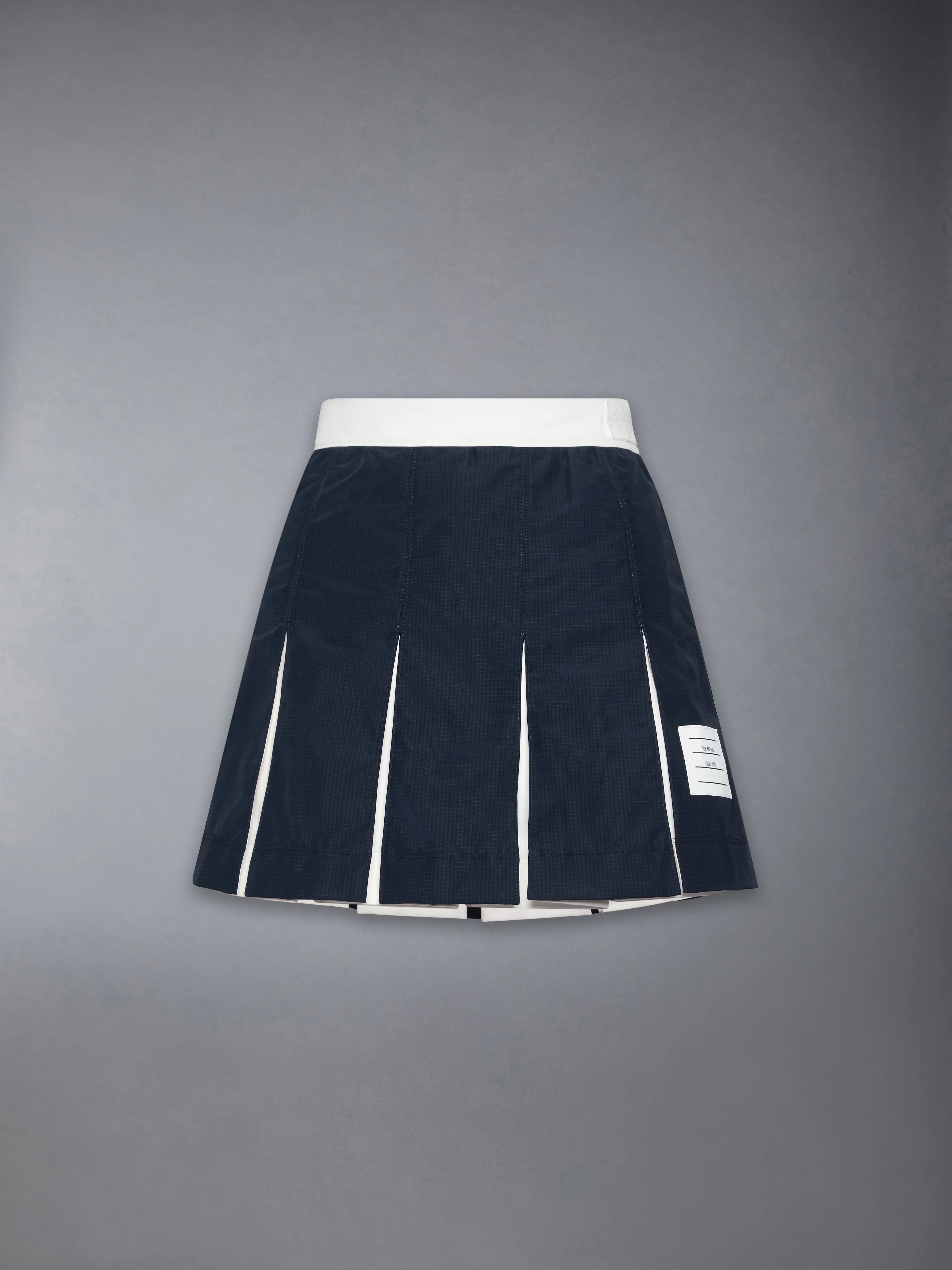 DETAILS & FIT Inspired by East Coast preppy icons but reimagined with inventive proportions and quality craftsmanship, our Ripstop Box Pleat Mini Skirt is a bold seasonal staple. Our Ripstop fabric is ultra-durable, tear and rip-resistant with a water-repellent finish. Pull on Name tag applique Signature striped grosgrain loop tab Model is 5'10" (178 cm), wearing size 40 100% Nylon Made in Italy FJK133A-07651-415