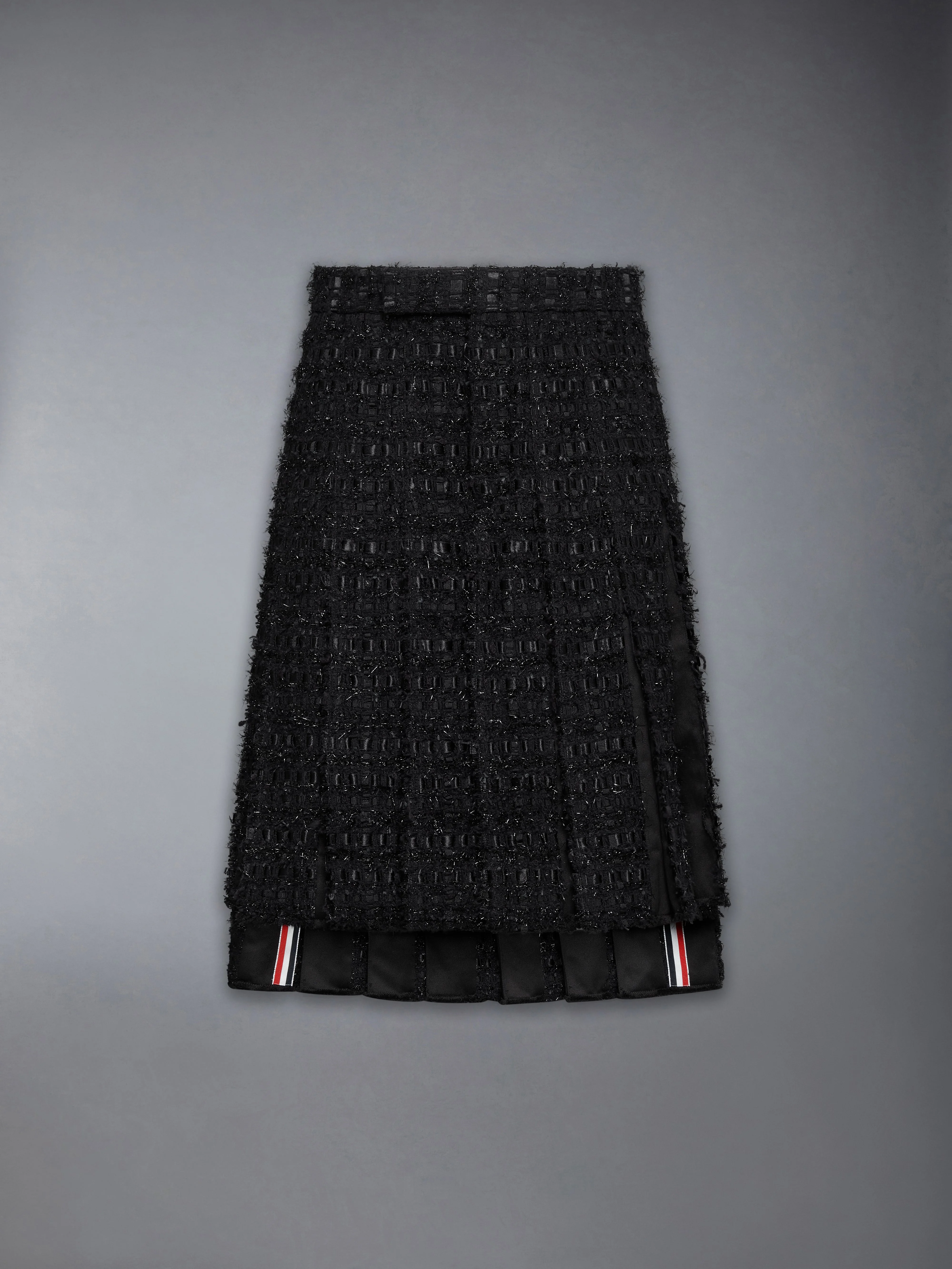 SATIN RIBBON TWEED FRAYED PLEATED SKIRT