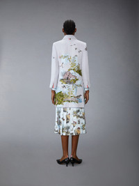 As geese take flight on their annual journey, gathering in graceful V-formations, they look ahead to brighter horizons, marking the passage of time and the start of something better. This piece celebrates change, growth, and new beginnings. It is a wearable narrative of unity and resilience, inviting you to step into each season with confidence and renewed purpose. Hidden front button closure Single Front flap pockets Buttoned cuffs with signature striped grosgrain trim Double vented back with signature striped grosgrain trim Signature striped grosgrain loop tab Model is 5'10" (178 cm), wearing size 40 55% Virgin Wool, 30% Silk, 15% Cashmere Combo 1: 51% Silk, 49% Wool Combo 2:100% Cotton Combo 3: 100% Polyester Combo4:100% Silk Lining: 100% Silk Made in Italy FOC709E-E1382-996