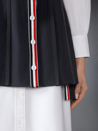 Crafted with signature Thom Browne emblems, this ultra-mini pleated skirt exudes playful energy and timeless style. Versatile and fun, it can be layered over one of our signature dress shirts or worn on its own for a bold statement. Front button closure with signature striped grosgrain trim Dropped back hem with signature striped grosgrain trim Signature striped grosgrain loop tab Model is 5'10" (178 cm), wearing size 40 50% Wool, 50% Polyester Made in Italy FGCA27A-02872-001