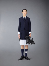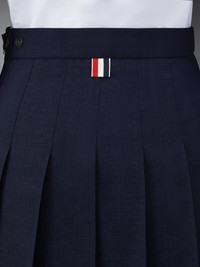 DETAILS & FIT Inspired by East Coast preppy icons but reimagined with inventive proportions and quality craftsmanship, our Plain Weave School Uniform Thigh Length Dropped Back Pleated Skirt is a fresh take on a traditional silhouette. Side zip closure Adjustable button backstrap Dropped back hem with signature grosgrain trim Signature striped grosgrain loop tab at back waist Model is 5' 10" (178cm), wearing size 40 50% Wool, 50% Polyester Lining: 100% Cupro Made in Italy FGC402V-02872-415 - Length: 46.0cm - WAIST: 70.0cm