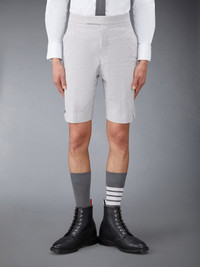 DETAILS & FIT Our Classic Seersucker Backstrap Shorts. Wide cuffs pay homage to Thom Browne’s distinguished tailoring. Enjoy our airy seersucker fabric during warmer months. Tab closure Creased legs Notched cuffs Slip side pockets Button-fastening jetted hip pockets Adjustable buttoned backstrap Signature striped grosgrain loop tab at back waist ClassicFit 1 Model is 6' 1" (185cm), wearing size 0 100% Cotton Lining: 100% Cupro Made in Italy MTC002H-00572-035
