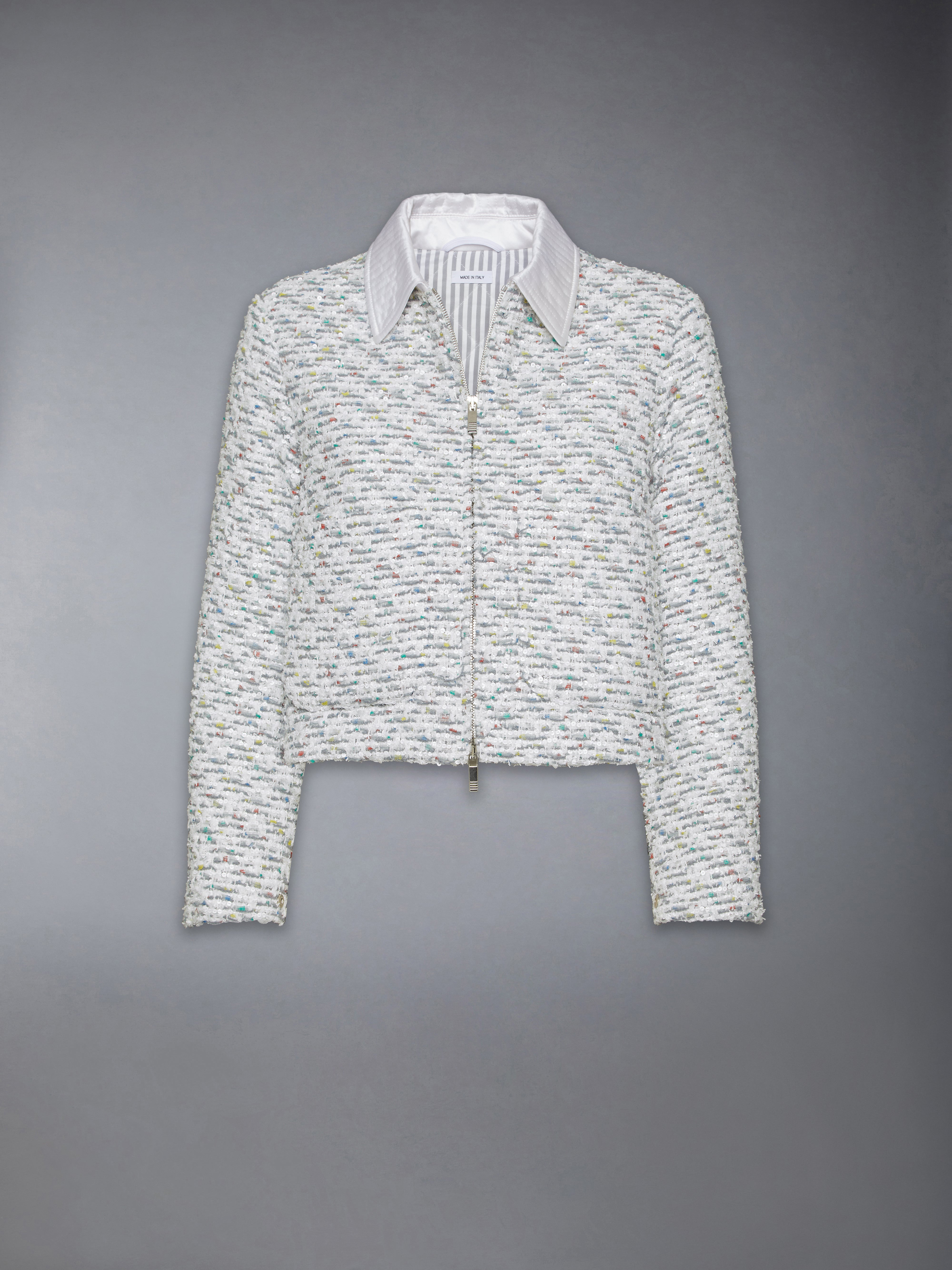 DETAILS & FIT A refined choice for this season's rounds, our Sequin Tweed Golf Jacket is an impeccable blend of tailored elegance and leisurely comfort. Our sequin tweed is woven with white chain thread, tulle, wooly yarn, sequins, and shiny ribbon. Front zip closure 2 Front patch pockets Signature striped grosgrain loop tab Model is 5'10" (178 cm), wearing size 40 55% Polyamide, 27% Polyester, 12% Virgin Wool, 6% Viscose Combo 1: 100% Silk Padding: 85% White Goose Down, 15% Polyester Lining: 100% Polyester Made in Italy FBD066X-F0801-035