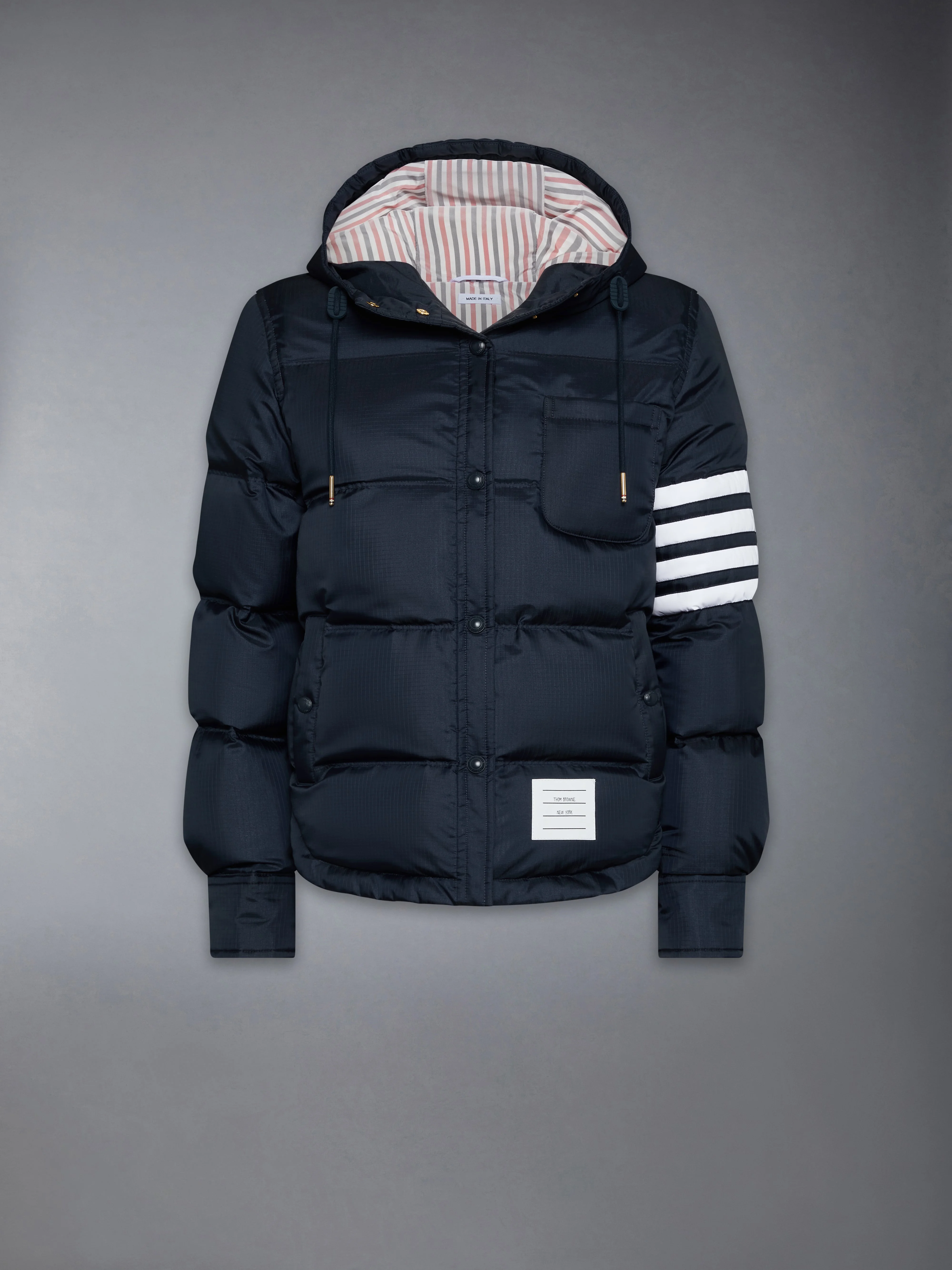 Shiny ripstop enters the collection as a lightweight, weather-resistant fabric, crafted into a down jacket that balances warmth with tailored form. A subtle sheen and durable grid texture bring depth to the material, while a shirtdress-inspired hem softens the silhouette. Complete the look with the season’s All-Terrain Boot—blending rugged functionality with elevated design. Front snap closure Drawstring hood with matte RWB-detailed aglets Patch chest pocket Welt hand pockets with snap Interior button pocket Snap-fastening cuffs Plain back yoke with locker loop Curved hem Tricolor lining 4-bar detailing Name tag applique Signature striped grosgrain loop tab Model is 5'10" (178 cm), wearing size 40 81% Polyamide, 19% Polyester Combo 1: 100% Polyester Combo 2: 80% White Goose Down, 20% White Goose Feathers Lining: 100% Made in Italy FBD076X-F1095-415