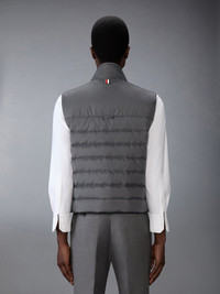Shiny ripstop enters the collection as a lightweight, weather-resistant fabric, crafted into a down-filled vest that balances warmth with tailored structure. A subtle sheen and durable grid texture add depth, while 4-bar detailing anchors the piece in Thom Browne’s signature language. Complete the look with the season’s All-Terrain Boot—blending rugged function with elevated design. Front snap closure with hidden zip Stand collar Hand pockets with hidden zip Two interior pockets with hidden zip Plain back yoke with locker loop 4-bar detailing Tricolor lining Signature striped grosgrain loop tab Model is 6'1" (185cm), wearing size 1 81% Polyamide, 19% Polyester Combo 1: 100% Polyester Padding: 80% White Goose Down, 20% White Goose Feathers Made in Italy MVD036X-F1095-025